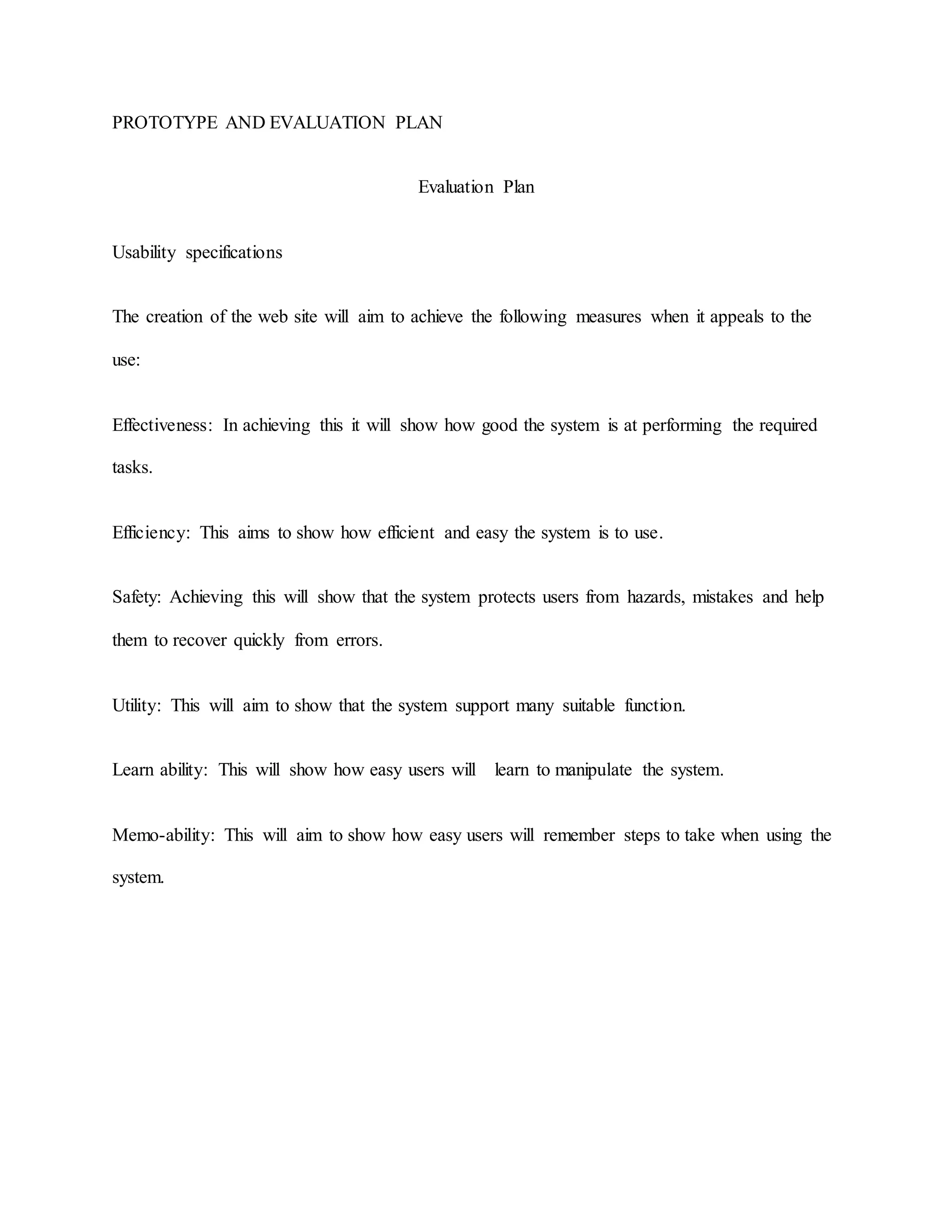 The document outlines an evaluation plan for a new Go-Jamaica website. A selection of random users will test the website and be asked to complete tasks like logging on, posting an item, and searching. Developers will observe users and record task times and issues. The evaluation aims to test usability factors like effectiveness, efficiency, safety, and learnability. Initial results found 93% of users completed tasks successfully, with only minor usability problems identified. Heuristic evaluations also examined consistency, error prevention, user control and other design principles. The website was found to meet requirements for easy navigation, logging in, posting and searching.