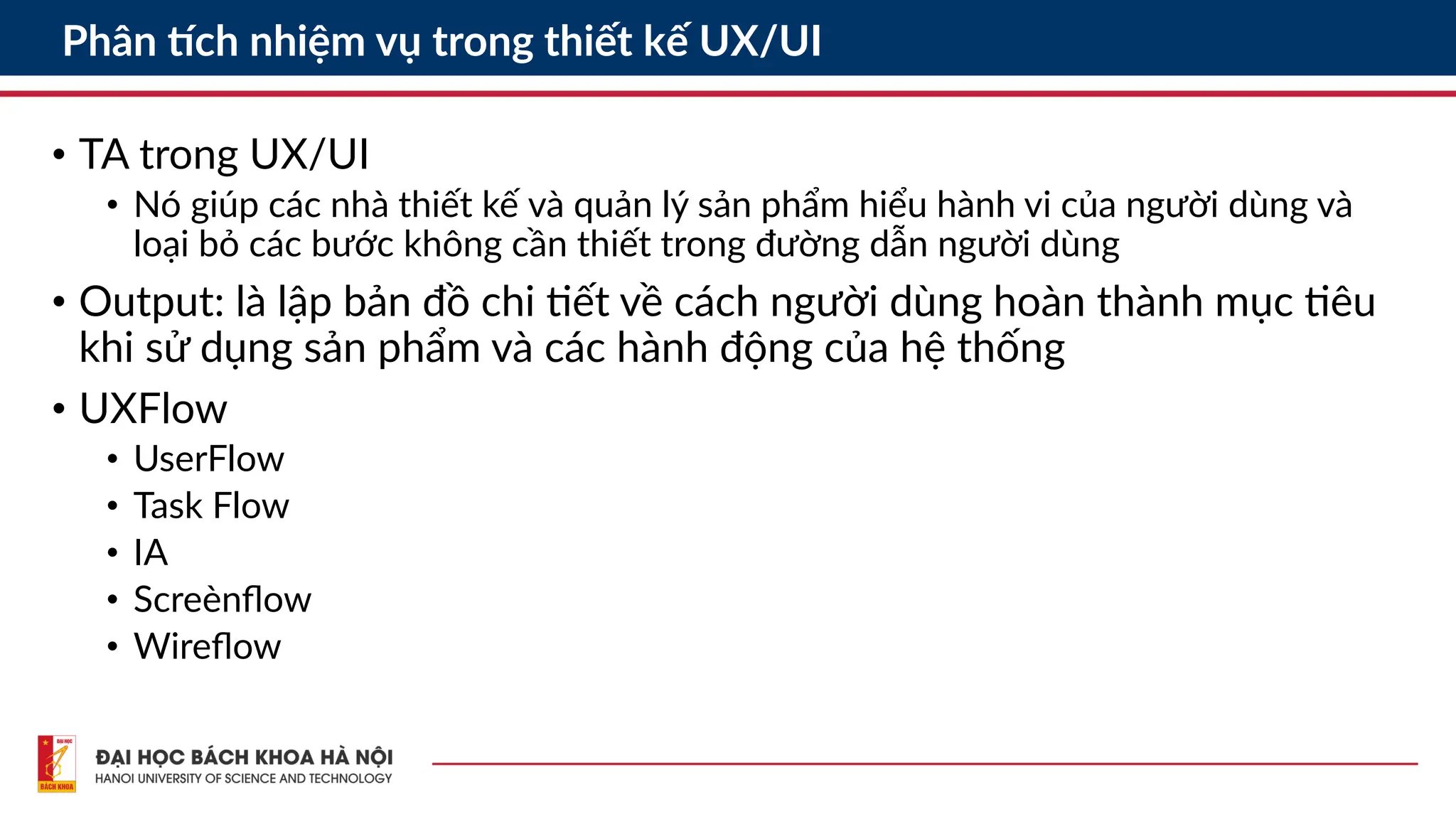 Phân tích nhiệm vụ trong thiết kế UX/UI giúp nhà thiết kế hiểu hành vi người dùng và tối ưu hóa trải nghiệm của họ bằng cách loại bỏ bước không cần thiết. Nó bao gồm việc lập bản đồ luồng người dùng, xác định điểm vào, hành động, phản hồi và các điểm quyết định trong quá trình hoàn thành nhiệm vụ. Sơ đồ phân tích nhiệm vụ giúp minh họa các bước người dùng thực hiện và tìm cơ hội cải tiến trải nghiệm.