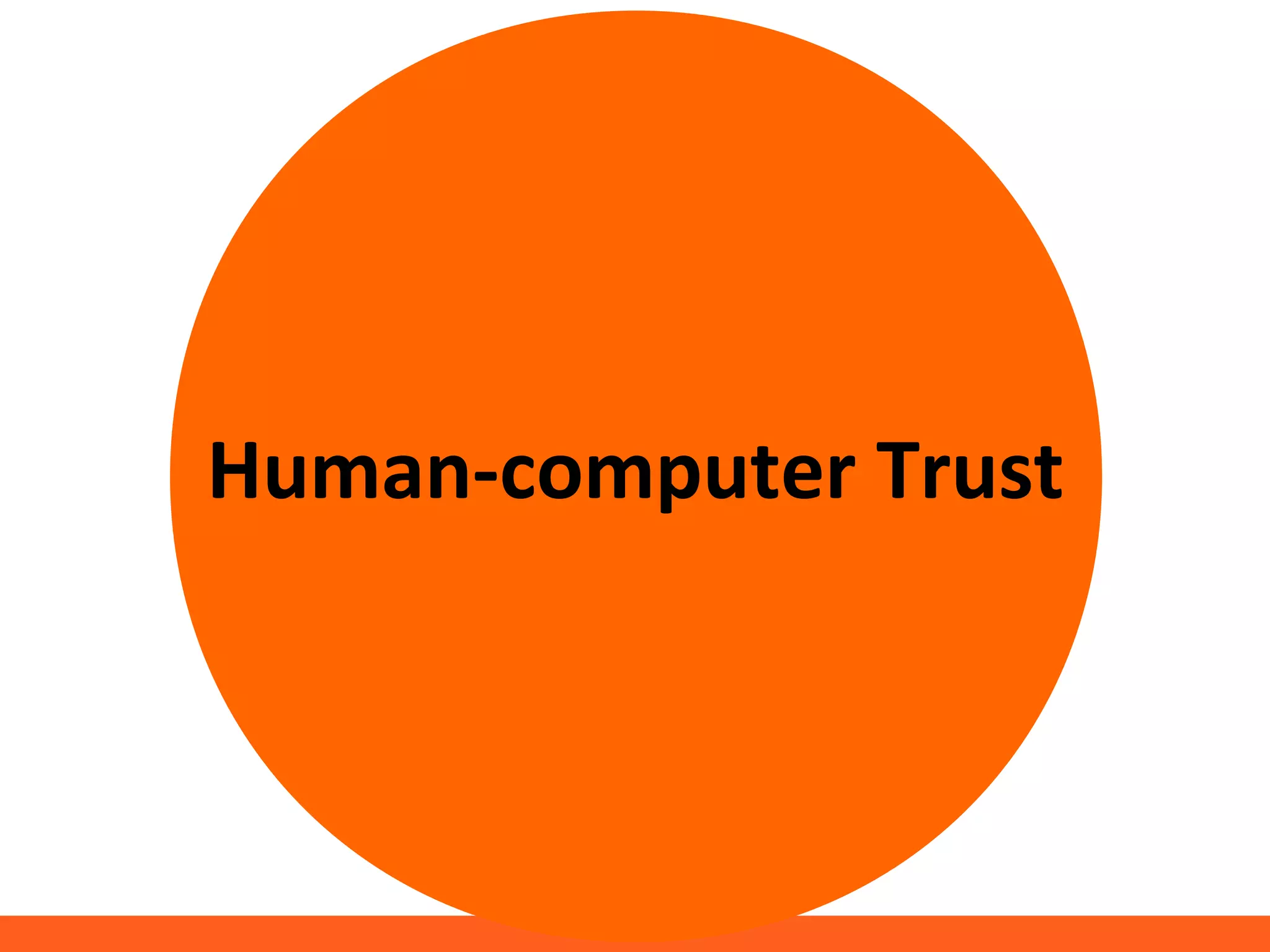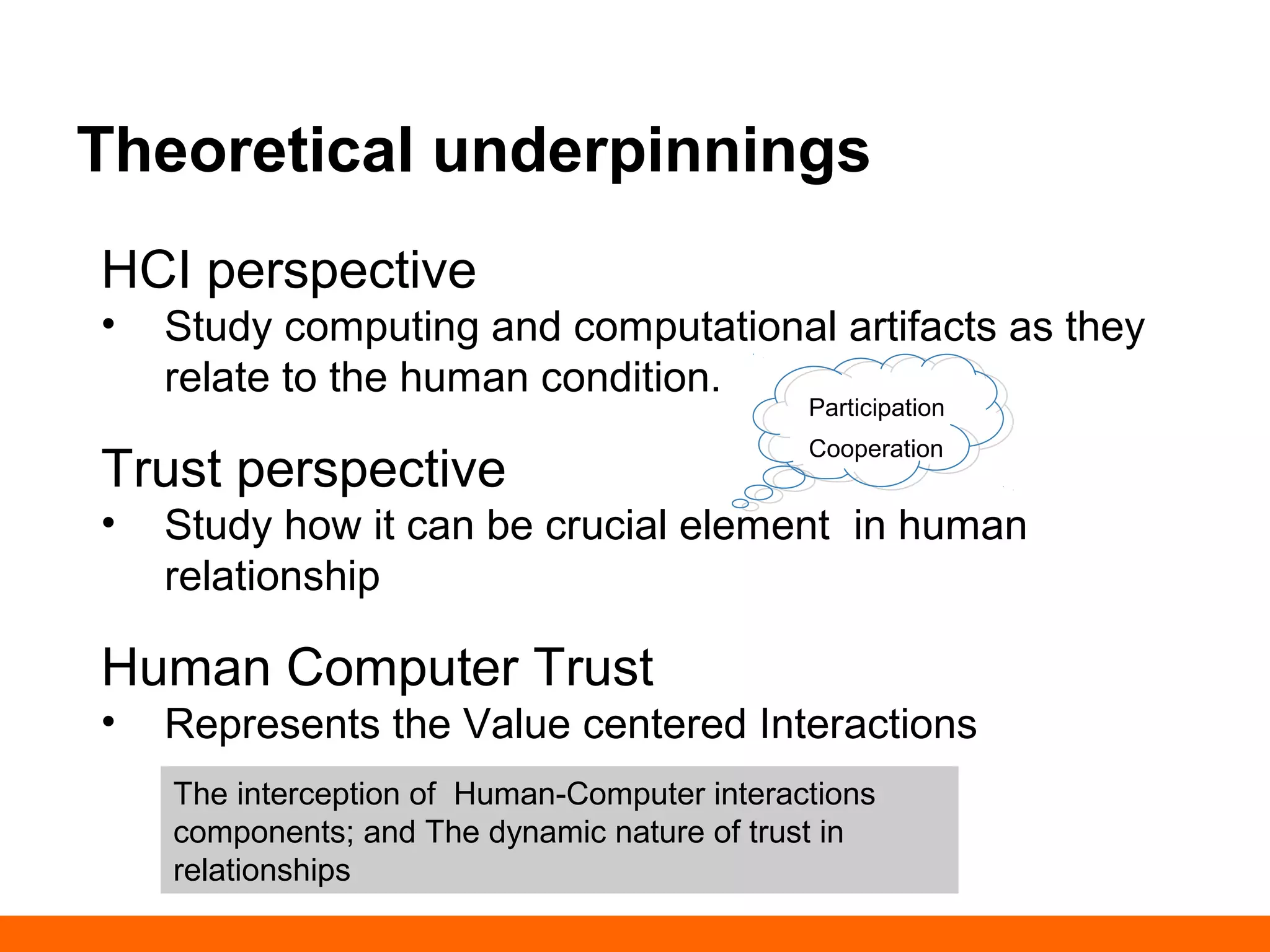 This document discusses human-computer trust from both an HCI and trust perspective. It examines trust as a crucial element in human relationships and represents value-centered interactions between humans and computers. The research aims to identify the social values and qualities that underlie people's trust beliefs and how those trustworthy qualities are represented with technology becoming more ubiquitous. Through literature reviews and participatory design sessions, the research models trust as a social phenomenon and validates how trust relates to users' activities. It identifies factors like honesty, reliability, and predictability that influence users' attitudes around sharing, relating, and communicating. The results are used to develop a model of human-computer trust and a design space toolset to assess and evaluate trust-en