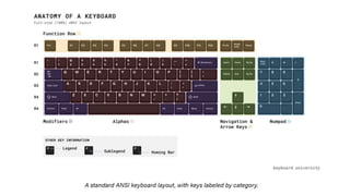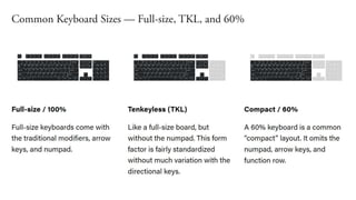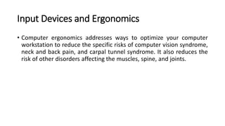 This document discusses human-computer interaction and input devices. It covers topics like computer ergonomics, computer vision syndrome, and how to properly set up a workstation to avoid health issues. Common input devices like keyboards, mice, microphones, webcams and touchscreens are described. Health risks of prolonged computer use like dry eyes, eyestrain and back pain are explained. The document provides guidance on selecting ergonomic equipment and maintaining a healthy posture.
