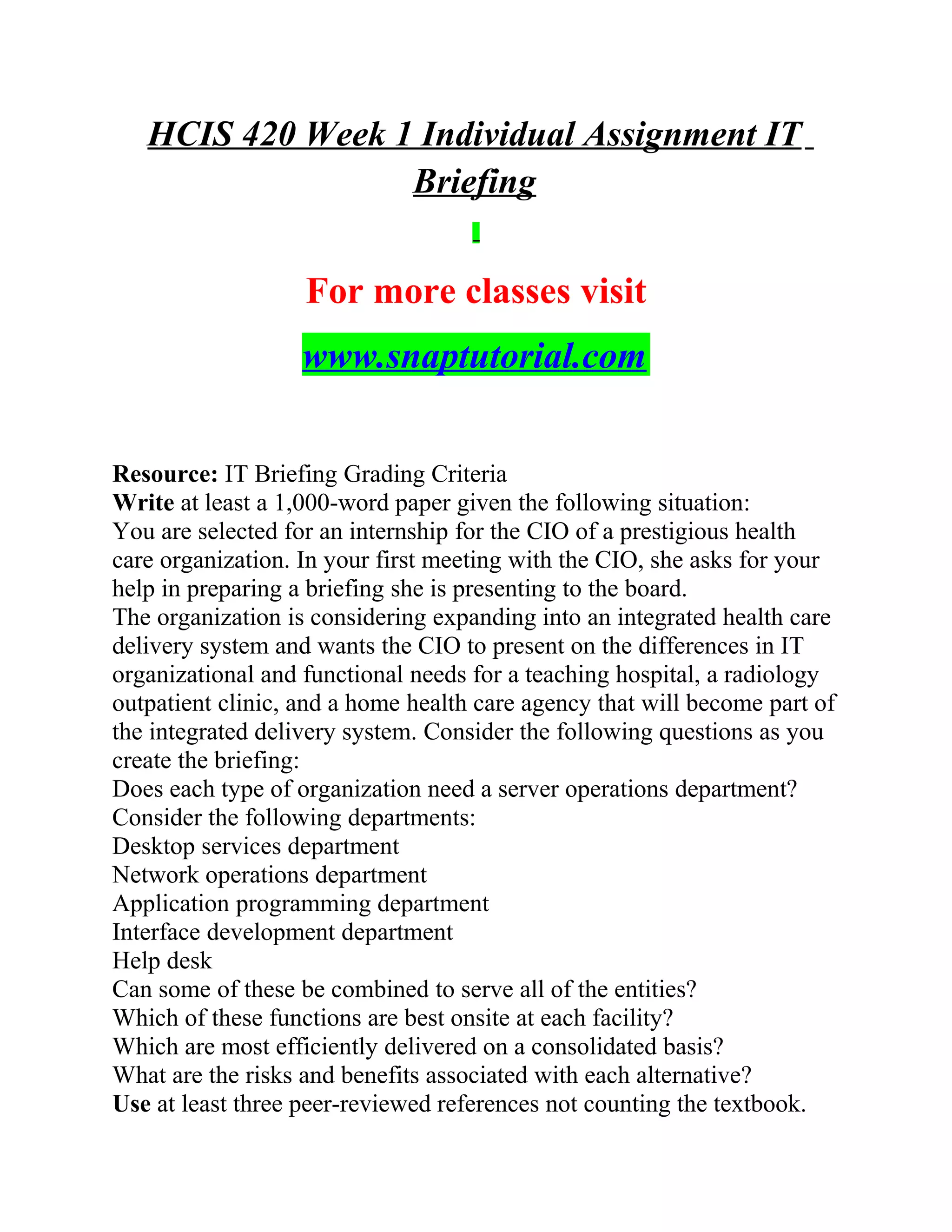 The document outlines a series of individual assignments for a health information management course, focusing on IT considerations in a healthcare setting. Topics include preparing briefings on various healthcare organizations' IT needs, understanding HIPAA's impact on IT, risk management strategies, and conducting risk analyses related to outsourcing and electronic health records. Each assignment requires research and adherence to APA formatting guidelines, with an emphasis on utilizing peer-reviewed references.