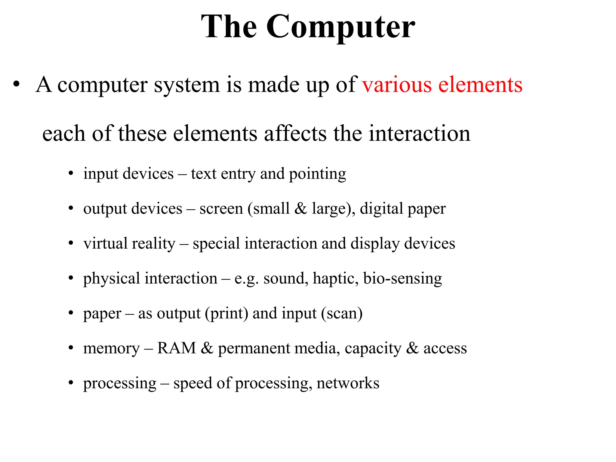 The document discusses various aspects of computer systems that affect human-computer interaction. It describes input devices like keyboards, mice, touchscreens, and speech recognition. It also covers output devices like displays, printers, and virtual reality headsets. It discusses computer components like memory, storage, processing speed, and networks. The goal is to understand computers in order to understand how people interact with them.