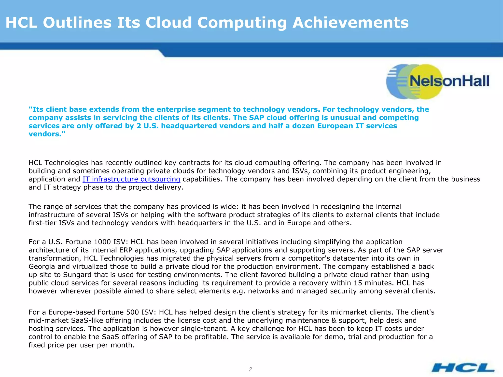 HCL Technologies has achieved recognition as a top-tier provider across various sectors, particularly in cloud computing, virtualization, and end-to-end services for the media and entertainment industry. The company has established a strong foothold in delivering managed infrastructure services and has been acknowledged for its innovative and flexible client engagement strategies, significantly enhancing its capabilities in SAP-related services. Additionally, HCL's commitment to empowering its workforce and sustainability initiatives has garnered positive acclaim in international markets.