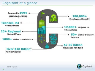 Cognizant's HCM capabilities include comprehensive human capital management solutions, with a focus on integrated talent management, HCM advisory services, and cloud implementation strategies. The company boasts over 2000 dedicated HCM associates and a proven track record across various industries, with significant client outcomes in cost optimization, employee engagement, and talent retention. Their strategic approach emphasizes process transformation through cloud technology, ensuring effective change management and collaboration with vendor partners for successful HCM implementation.