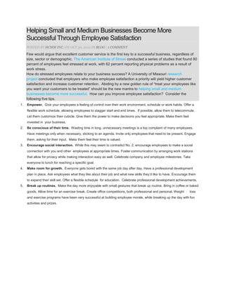 Small and medium businesses can improve employee satisfaction and increase success through five key tips: (1) Empower employees by giving them control over their work environment and schedule; (2) Respect employees' time by keeping meetings concise and focused; (3) Foster social interaction and communication between employees; (4) Support employees' professional growth with development plans and opportunities to expand skills; (5) Break up routines with small gestures like providing snacks or allowing exercise breaks to make the workday more enjoyable. Prioritizing employee satisfaction leads to higher customer satisfaction and retention according to research, treating employees well as customers are treated.