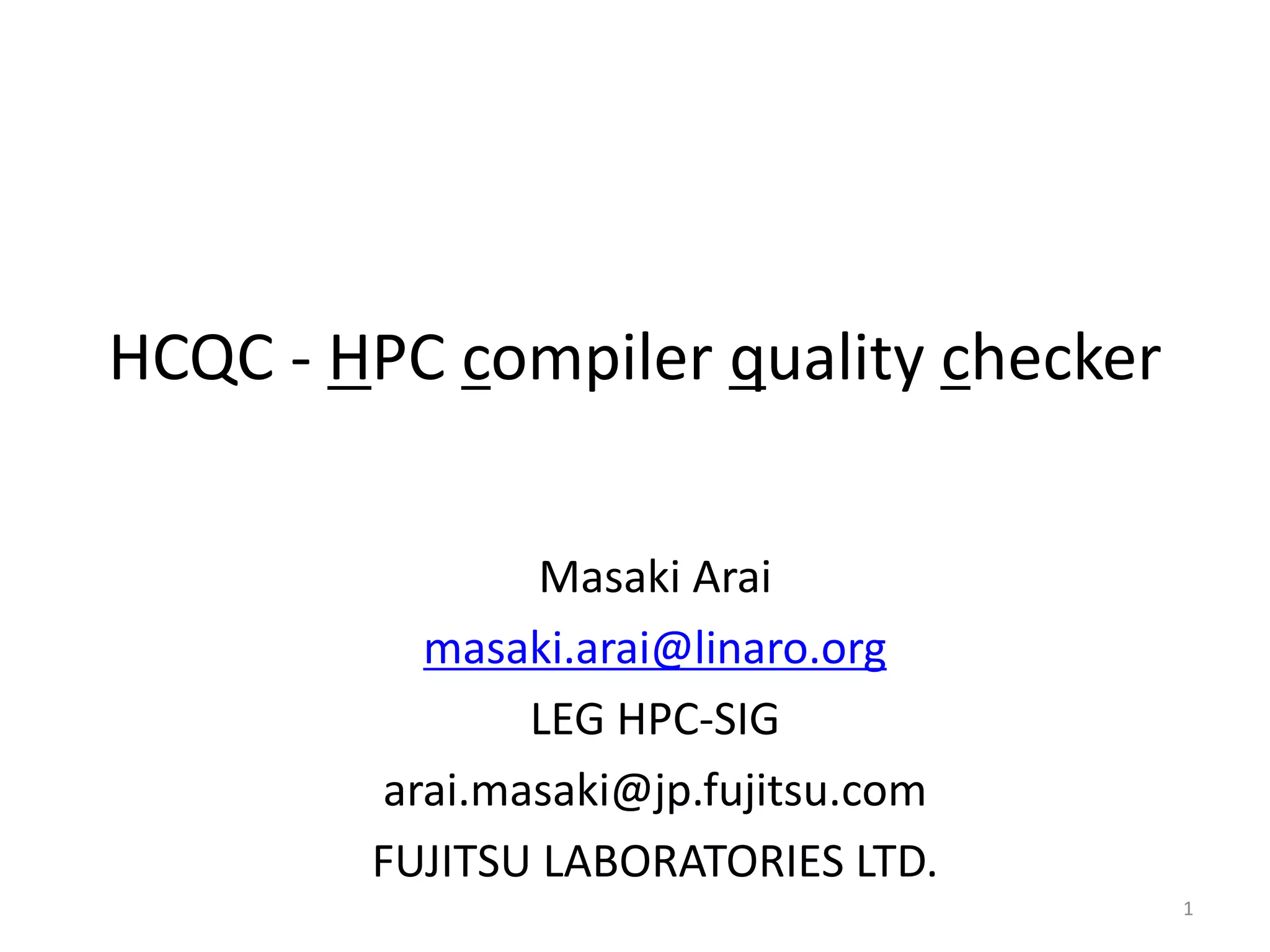 The document introduces the HPC Compiler Quality Checker (hcqc), a tool developed by Masaki Arai to evaluate and improve the quality of compiler optimizations in high-performance computing applications. It outlines the metrics and configuration needed for quality evaluation, presents various comparisons between different compilers, and discusses future work for enhancements including support for new features and architectures. The hcqc aims to facilitate better performance assessments through detailed analysis of compiler behavior on specific kernels.