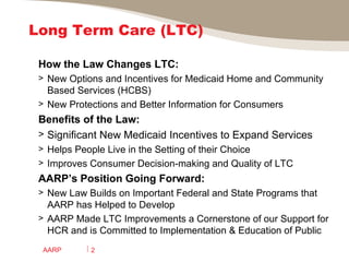 The document discusses several provisions in the Affordable Care Act that improve long-term care services. It outlines new Medicaid options that provide incentives for states to expand home- and community-based services, including a 6% matching rate for attendant services. It also discusses protections for nursing home residents, including easier access to complaint and inspection information online. Overall, the provisions are aimed at improving quality, consumer information and choice, and rebalancing long-term care toward home- and community-based settings.