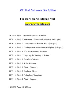 The document outlines assignments for the HCS 131 course, focusing on various aspects of communication in the workplace across five weeks. Each week includes specific tasks like writings, memos, presentations, and summaries related to topics such as effective communication, conflict resolution, and teamwork. The assignments aim to enhance students' understanding and application of communication principles in health care settings.