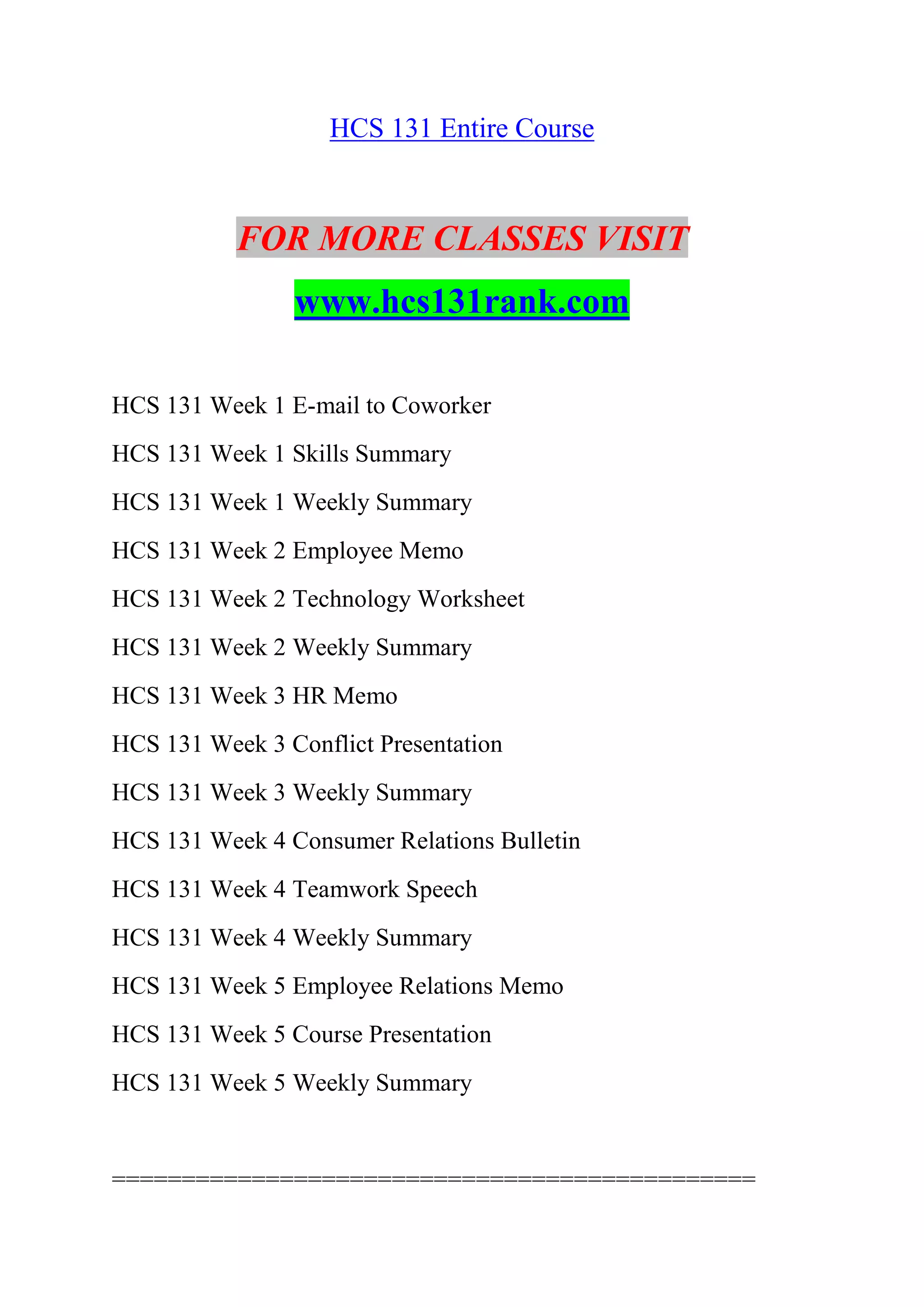 The document outlines weekly activities and assignments for the HCS 131 course, focusing on communication in the workplace, cross-cultural communication, conflict resolution, and teamwork. It includes specific tasks like writing memos, summaries, and presentations that emphasize effective communication strategies and the importance of positive employee relations in a healthcare context. Each week encourages reflection on learning experiences and the application of concepts in real-life scenarios.