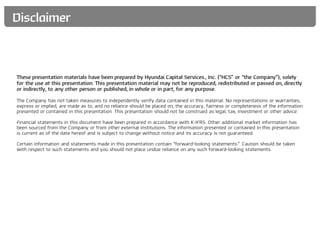 Hyundai Capital Services reported financial results for the first half of 2017. While total assets grew 3.4% to 25.9 trillion won, net income decreased 28.6% to 162.3 billion won due to one-time gains in the prior year period. Asset quality remained stable with the 30+ day delinquency ratio unchanged at 2.1% and the FSS requirement coverage ratio slightly decreased to 120.8%. Overseas subsidiaries continued growing, contributing 42.4 billion won in equity method income. Going forward, Hyundai Capital will focus on expanding its global operations and diversifying its funding sources.