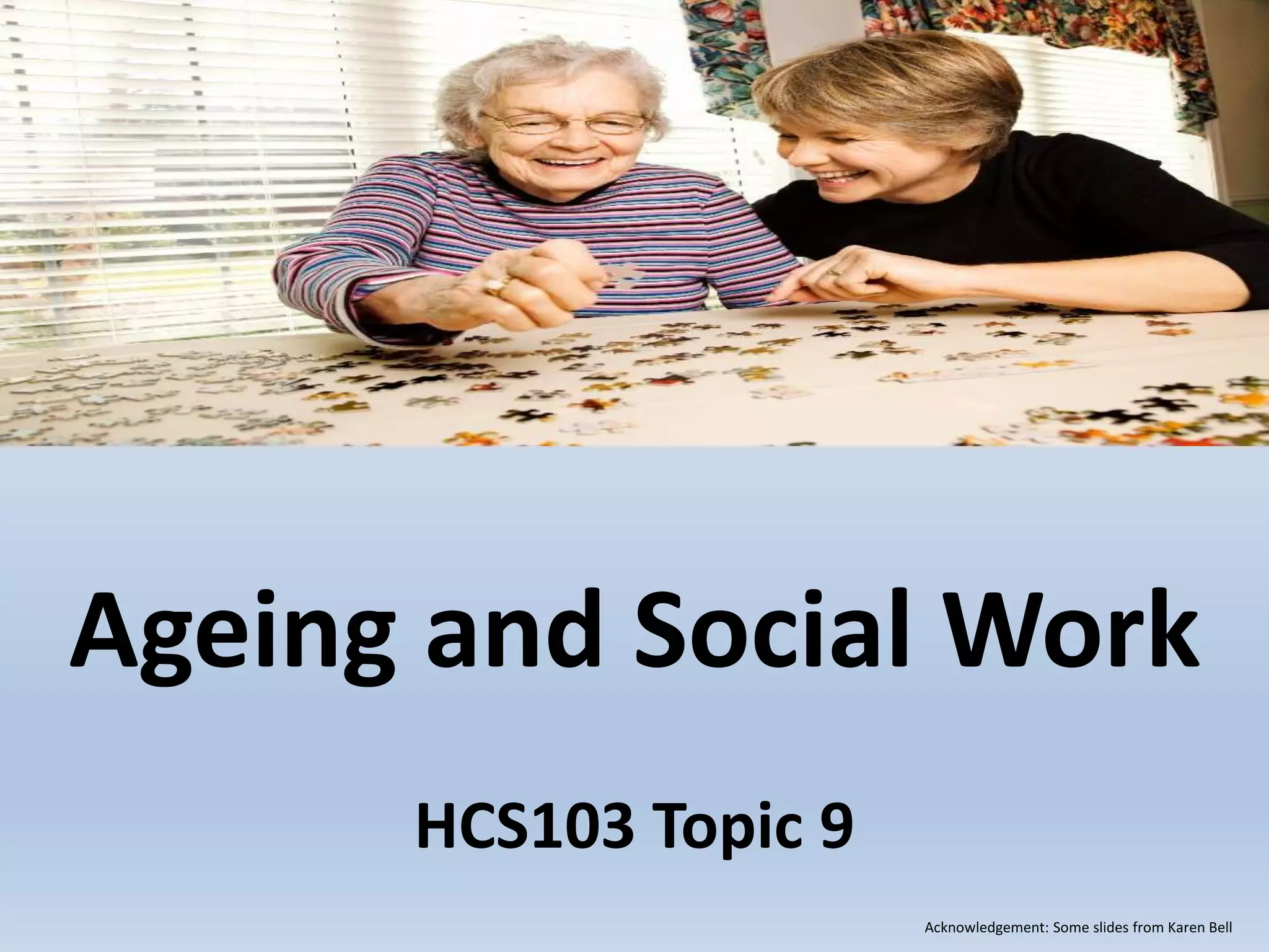 This document provides an overview of ageing and social work. It discusses stereotypes and perceptions of older people, changing demographics as the population ages, theoretical perspectives on aging, policy reforms in aged care, and specific areas of social work practice including dementia, palliative care, and elder abuse. Traditional and emerging settings for social work with older clients are outlined. The roles of social workers in counseling, advocacy, assessment, and case management are also summarized.