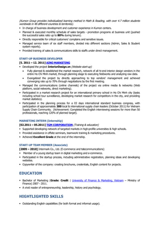 This document provides a summary of Ho Cong Thanh's professional experience and qualifications. It outlines his work history in business and marketing roles, including as business development leader for The Bean Store restaurant chain and service leader for Kumon Vietnam tutoring company. It also lists his education in marketing and highlighted skills in English, social media marketing, content creation, and people leadership. Contact information and professional references are provided at the end.