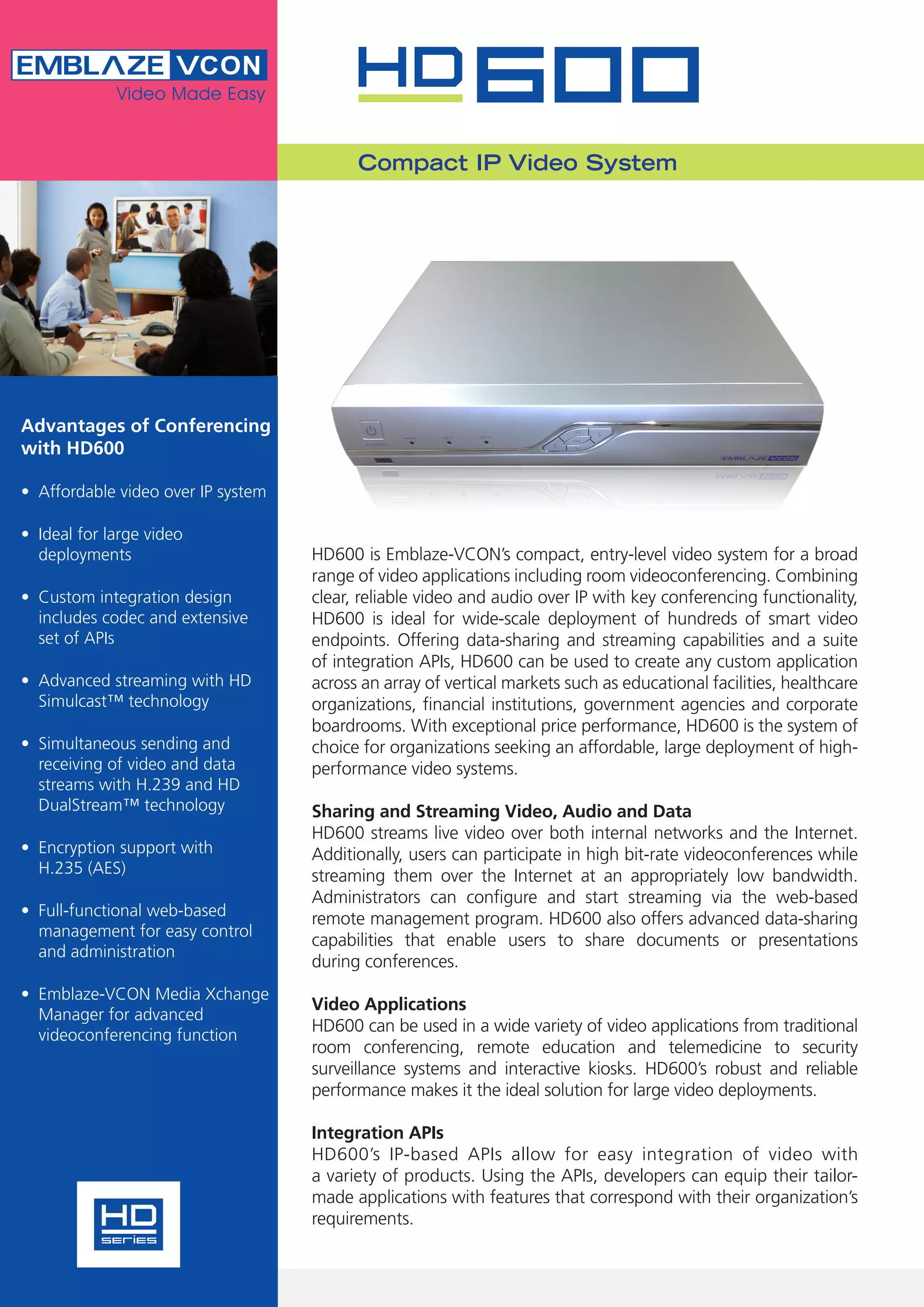 HD600 is Emblaze-VCON's compact video conferencing system that provides clear video and audio over IP for large deployments. It offers advanced streaming capabilities and integration APIs. HD600 is affordable and ideal for organizations seeking to deploy high-performance video systems across various industries like education, healthcare, and corporations. It streams live video over networks and the internet while sharing documents and presentations during calls.