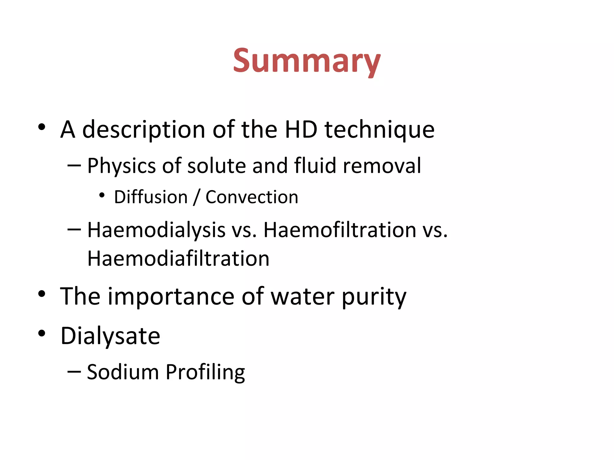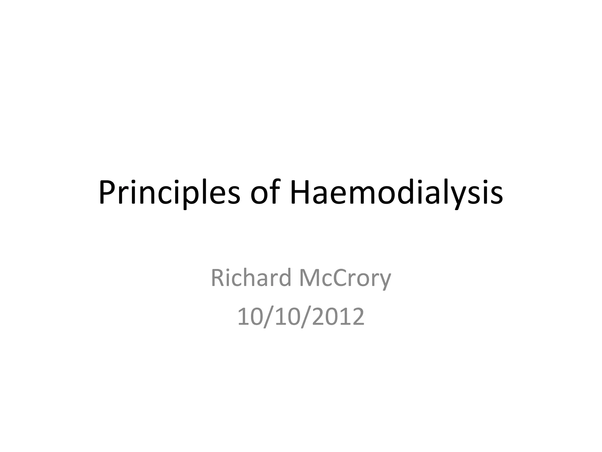 This document provides an overview of principles of haemodialysis. It describes the components of haemodialysis including the blood circuit, dialysate circuit and dialyzer. It explains how diffusion and convection work to remove solutes and fluid across the dialyzer membrane. High water purity standards are required for patient safety. Haemodiafiltration combines diffusive and convective clearances and may provide benefits over standard haemodialysis.
