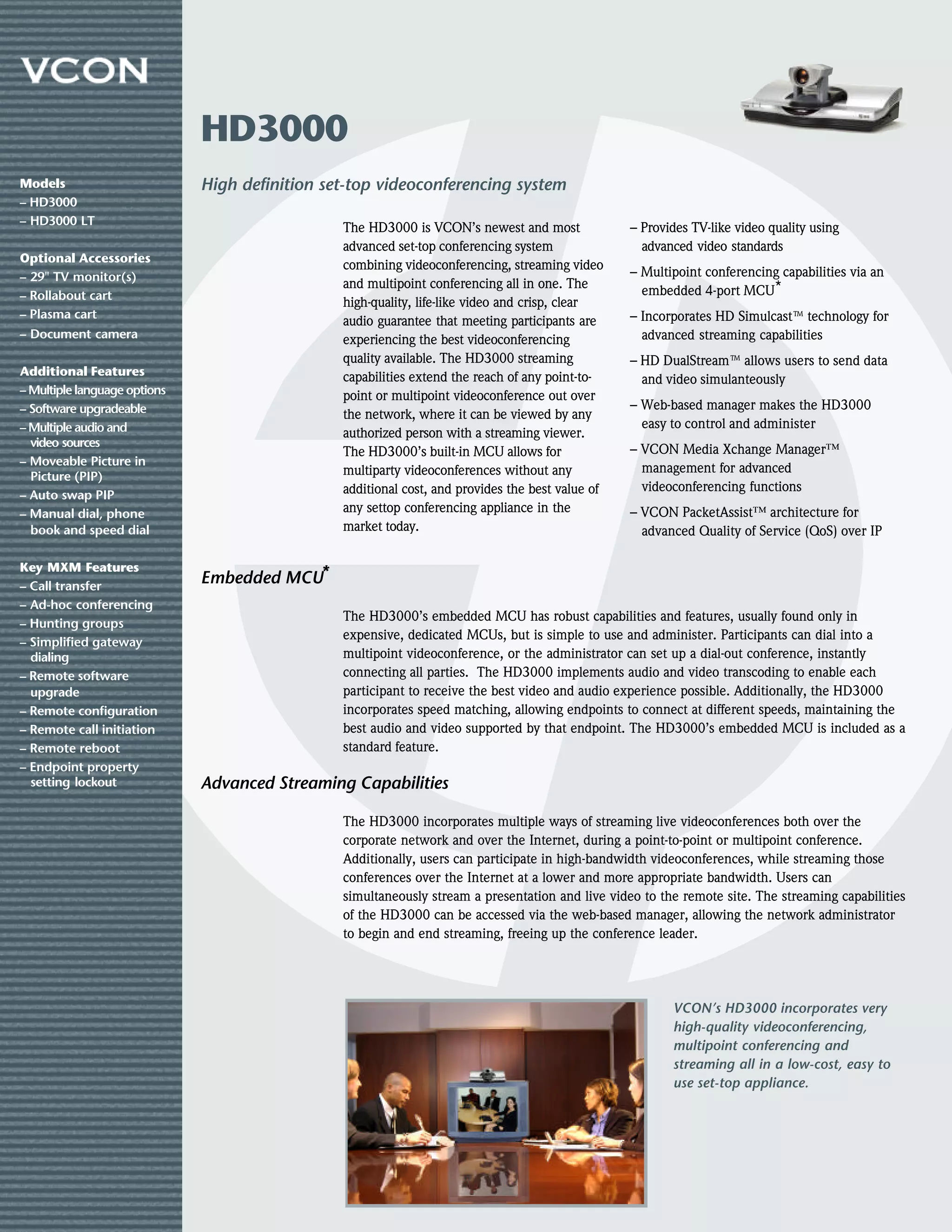 The HD3000 is VCON's newest set-top videoconferencing system that provides high-definition video calling, multipoint conferencing, and streaming capabilities in a single device. It supports advanced video standards for life-like video quality and allows up to 4 participants to connect in a multipoint call through its embedded MCU. The HD3000 also enables streaming video conferences over the network through HD Simulcast technology and simultaneous sending of presentation data.