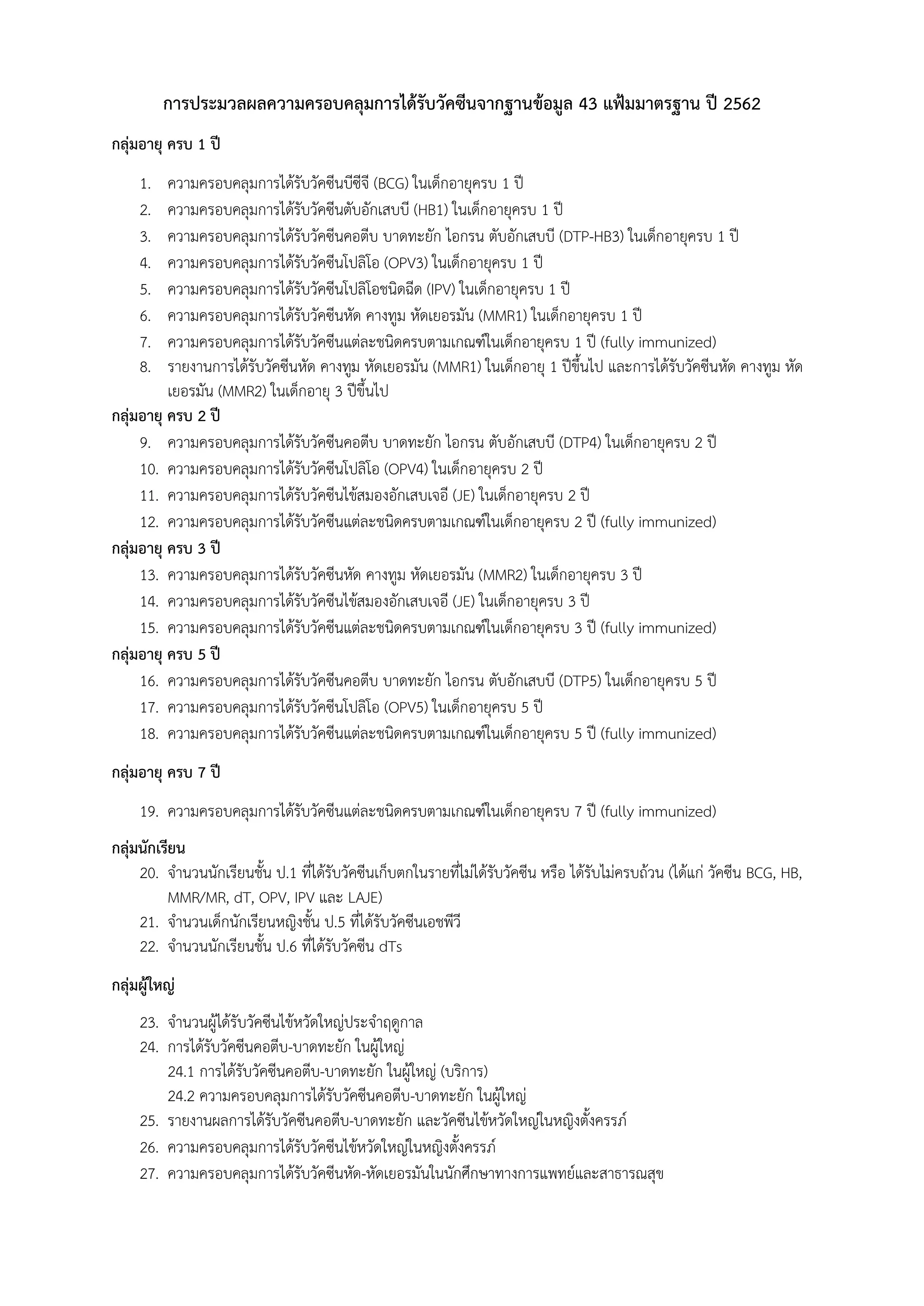 7 ปี (fully immunized) คานิยาม ความครอบคลุมการได้รับวัคซีนแต่ละชนิดครบตามเกณฑ์ในเด็กอายุครบ 7 ปี หมายถึง ร้อยละของเด็กอายุครบ 7 ปี ในงวดที่รายงานที่ได้รับวัคซีนแต่ละชนิดครบตามเกณฑ์ ตั้งแต่แรกเกิดจนอายุครบ 7 ปี ได้แก่ วัคซีน BCG, HB, DTP-HB3, OPV3, MMR1, JE, DTP4, OPV4, MMR2/MMRc/MRc, DTP5 และ OPV5 จากเด็กอายุครบ 7 ปี ที่อาศัย อยู่จริงในพื้นที่รับผิดชอบทั้งหมด ในงวดที่รายงาน วัตถุประสงค์ที่ใช้ประมวลผล เพื่อประเมินความครอบคลุมการได้รับวัคซีนก่อนวัยเรียนชั้น ประถมศึกษาที่มีแนวทางในการตรวจสอบประวัตินักเรียนชั้น ป. 1 ทุกรายก่อนที่ให้วัคซีน ในรายที่ได้รับไม่ครบถ้วนตามเกณฑ์ที่กาหนดโดยกรมควบคุมโรค เกณฑ์เป้าหมาย ไม่น้อยกว่าร้อยละ 90 (ยกเว้นวัคซีน MMR1และ MMR2/MMRc/MRc ไม่น้อยกว่าร้อย ละ 95) ประชากรกลุ่มเป้าหมาย เด็กอายุครบ 7 ปี ที่อาศัยอยู่จริงในพื้นที่รับผิดชอบทั้งหมด ในงวดที่รายงาน (จากแฟ้ม Person ตามมาตรฐานโครงสร้าง 43 แฟ้มสถานะบุคคล Typearea = 1, 3 และ 5) โดยความหมายของเด็กอายุครบ 7 ปี หมายถึง เด็กที่มีอายุครบ 7 ปี ในงวดที่รายงาน ซึ่ง เกิดในช่วงเดือนเดียวกับงวดที่รายงาน แต่ผ่านมาแล้ว 7 ปี เช่น รายงานงวดที่ 1 : ตุลาคม 2561 - ธันวาคม 2561 เด็กที่มีอายุครบ 7 ปี ได้แก่ เด็กที่เกิดระหว่างวันที่ 1 ตุลาคม 2554 - 31 ธันวาคม 2554 วิธีการจัดเก็บข้อมูล รวบรวมข้อมูลจากระบบรายงานมาตรฐาน 43 แฟ้ม กระทรวงสาธารณสุข แหล่งข้อมูล ฐานข้อมูล 43 แฟ้ม รายการข้อมูล 1 A = จานวนเด็กอายุครบ 7 ปี ในงวดที่รายงานที่ได้รับวัคซีนแต่ละชนิดครบตามเกณฑ์ ได้แก่ วัคซีน BCG, HB, DTP-HB3, OPV3, MMR1, JE, DTP4, OPV4, MMR2/MMRc/ MRc, DTP5 และ OPV5 รายการข้อมูล 2 B = จานวนเด็กอายุครบ 7 ปี ที่อาศัยอยู่จริงในพื้นที่รับผิดชอบทั้งหมด ในงวดที่รายงาน จากแฟ้ม Person ตามมาตรฐานโครงสร้าง 43 แฟ้ม(สถานะบุคคล Typearea = 1, 3 และ 5) 1= มีชื่ออยู่ตามทะเบียนบ้านในเขตรับผิดชอบและอยู่จริง 3 = มาอาศัยอยู่ในเขตรับผิดชอบ (ตามทะเบียนบ้านในเขตรับผิดชอบ) แต่ทะเบียนบ้าน อยู่นอกเขตรับผิดชอบ 5= มาอาศัยในเขตรับผิดชอบแต่ไม่ได้อยู่ตามทะเบียนบ้านในเขตรับผิดชอบ เช่น คน เร่ร่อน ไม่มีที่พักอาศัย เป็นต้น รายการข้อมูล 3 รหัสวัคซีนที่ใช้ประมวลผล คือ (1) BCG= 010 (2) HB1= 041 (3) DTP-HB3 ได้แก่ รหัสวัคซีน 093 หรือ มี 2 รหัสพร้อมกัน คือ (033 + 043) หรือ D23 หรือ D53 หรือ มี 2 รหัสพร้อมกันในแผนและนอกแผน คือ (D13+ 043) หรือ (D33+ 043) หรือ (D43+ 043) (4) OPV3 ได้แก่ รหัสวัคซีน 083 หรือ D33 หรือ D43 หรือ D53 (5) MMR1 ได้แก่ รหัสวัคซีน 061 หรือ M11 (6) JE ได้แก่ JE1= 051, JE2=052, JE3= 053, LAJE1= J11, LAJE2= J12 (รหัส 051+ รหัส 052+รหัส 053 หรือ รหัส 051+รหัส 052+รหัส J11 หรือ รหัส 051+รหัส J11+ รหัส 052 หรือ รหัส 051+รหัส J11+รหัส J12 หรือ รหัส J11+รหัส J12 หรือ รหัส J11+ รหัส 051) (7) DTP4 ได้แก่ รหัสวัคซีน = 034 หรือ D14 หรือ D24 หรือ D34 หรือ D44 หรือ D54 (8) OPV4 ได้แก่ ร