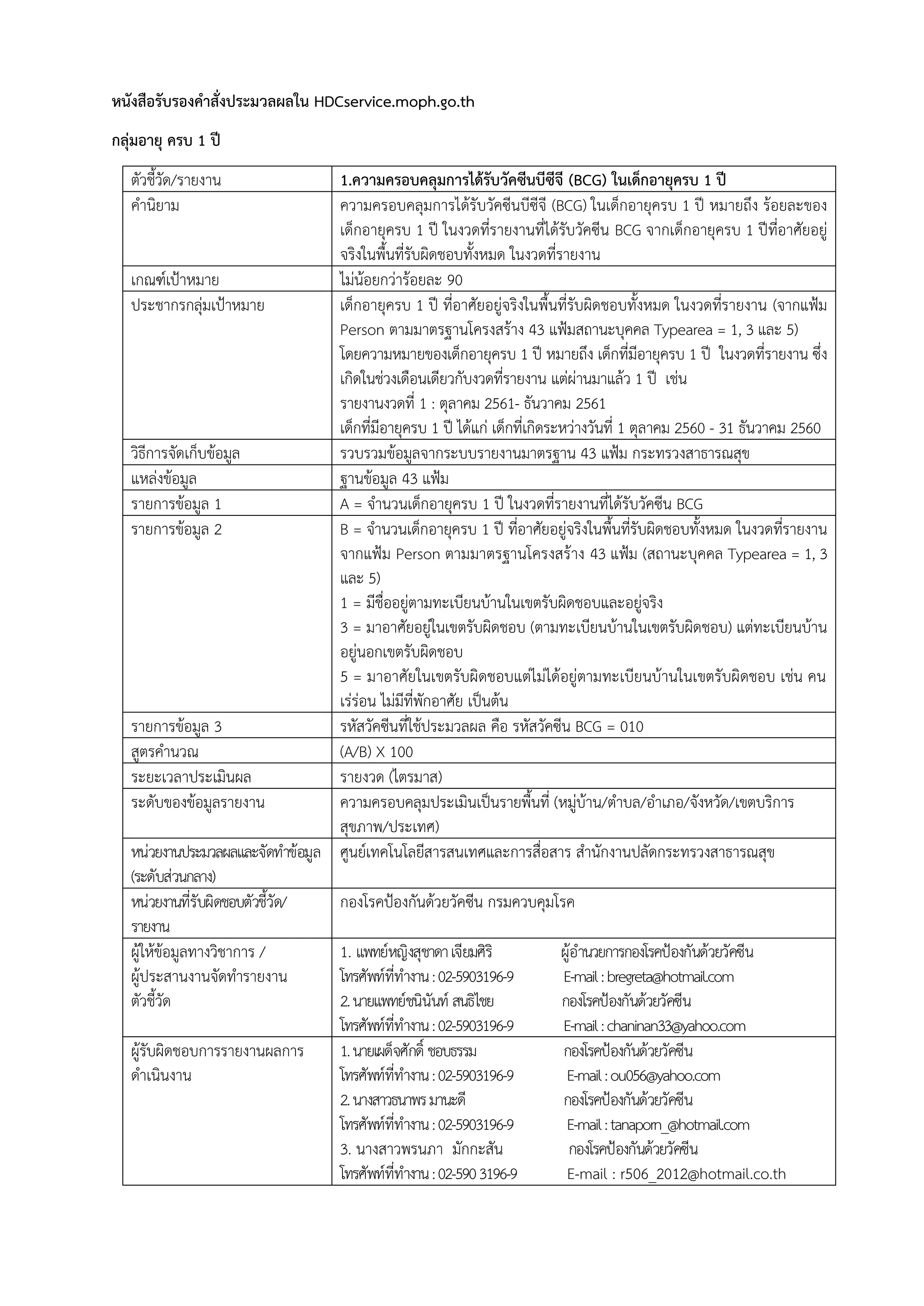/ ผู้ประสานงานจัดทารายงาน ตัวชี้วัด 1. แพทย์หญิงสุชาดาเจียมศิริ ผู้อานวยการกองโรคป้องกันด้วยวัคซีน โทรศัพท์ที่ทางาน:02-5903196-9 E-mail:bregreta@hotmail.com 2.นายแพทย์ชนินันท์ สนธิไชย กองโรคป้องกันด้วยวัคซีน โทรศัพท์ที่ทางาน:02-5903196-9 E-mail:chaninan33@yahoo.com ผู้รับผิดชอบการรายงานผลการ ดาเนินงาน 1.นายเผด็จศักดิ์ ชอบธรรม กองโรคป้องกันด้วยวัคซีน โทรศัพท์ที่ทางาน:02-5903196-9 E-mail:ou056@yahoo.com 2.นางสาวธนาพรมานะดี กองโรคป้องกันด้วยวัคซีน โทรศัพท์ที่ทางาน:02-5903196-9 E-mail:tanaporn_@hotmail.com 3. นางสาวพรนภา มักกะสัน กองโรคป้องกันด้วยวัคซีน โทรศัพท์ที่ทางาน:02-5903196-9 E-mail : r506_2012@hotmail.co.th ตัวชี้วัด/รายงาน 12. ความครอบคลุมการได้รับวัคซีนแต่ละชนิดครบตามเกณฑ์ในเด็กอายุครบ 2 ปี (fully immunized) คานิยาม ความครอบคลุมการได้รับวัคซีนแต่ละชนิดครบตามเกณฑ์ในเด็กอายุครบ 2 ปี หมายถึง ร้อยละของเด็กอายุครบ 2 ปี ในงวดที่รายงานที่ได้รับวัคซีนแต่ละชนิดครบตามเกณฑ์ ตั้งแต่แรกเกิดจนอายุครบ 2 ปี ได้แก่ วัคซีน BCG, HB, DTP-HB3, OPV3, MMR1, JE, DTP4 และ OPV4 จากเด็กอายุครบ 2 ปี ที่อาศัยอยู่จริงในพื้นที่รับผิดชอบทั้งหมด ใน งวดที่รายงาน เกณฑ์เป้าหมาย ไม่น้อยกว่าร้อยละ 90 ประชากรกลุ่มเป้าหมาย เด็กอายุครบ 2 ปี ที่อาศัยอยู่จริงในพื้นที่รับผิดชอบทั้งหมด ในงวดที่รายงาน (จากแฟ้ม Person ตามมาตรฐานโครงสร้าง 43 แฟ้มสถานะบุคคล Typearea = 1, 3 และ 5) โดยความหมายของเด็กอายุครบ 2 ปี หมายถึง เด็กที่มีอายุครบ 2 ปี ในงวดที่รายงาน ซึ่ง เกิดในช่วงเดือนเดียวกับงวดที่รายงาน แต่ผ่านมาแล้ว 2 ปี เช่น รายงานงวดที่ 1 : ตุลาคม 2561 - ธันวาคม 2561 เด็กที่มีอายุครบ 2 ปี ได้แก่ เด็กที่เกิดระหว่างวันที่ 1 ตุลาคม 2559 - 31 ธันวาคม 2559 วิธีการจัดเก็บข้อมูล รวบรวมข้อมูลจากระบบรายงานมาตรฐาน 43 แฟ้ม กระทรวงสาธารณสุข แหล่งข้อมูล ฐานข้อมูล 43 แฟ้ม รายการข้อมูล 1 A = จานวนเด็กอายุครบ 2 ปี ในงวดที่รายงานที่ได้รับวัคซีนแต่ละชนิดครบตามเกณฑ์ ได้แก่ วัคซีน BCG, HB, DTP-HB3, OPV3, MMR1, JE, DTP4 และ OPV4 รายการข้อมูล 2 B = จานวนเด็กอายุครบ 2 ปี ที่อาศัยอยู่จริงในพื้นที่รับผิดชอบทั้งหมด ในงวดที่รายงาน จากแฟ้ม Person ตามมาตรฐานโครงสร้าง 43 แฟ้ม (สถานะบุคคล Typearea = 1, 3 และ 5) 1 = มีชื่ออยู่ตามทะเบียนบ้านในเขตรับผิดชอบและอยู่จริง 3 = มาอาศัยอยู่ในเขตรับผิดชอบ (ตามทะเบียนบ้านในเขตรับผิดชอบ) แต่ทะเบียนบ้าน อยู่นอกเขตรับผิดชอบ 5 = มาอาศัยในเขตรับผิดชอบแต่ไม่ได้อยู่ตามทะเบียนบ้านในเขตรับผิดชอบ เช่น คน เร่ร่อน ไม่มีที่พักอาศัย เป็นต้น รายการข้อมูล 3 รหัสวัคซีนที่ใช้ประมวลผล คือ (1) BCG= 010 (2) HB1= 041 (3) DTP-HB3 ได้แก่ รหัสวัคซีน 093 หรือ มี 2 รหัสพร้อมกัน คือ (033 + 043) หรือ D23 หรือ D53 หรือ มี 2 รหัสพร้อมกันในแผนและนอกแผน คือ (D13+ 043) หรือ (D33+ 043) หรือ (D43+ 043)