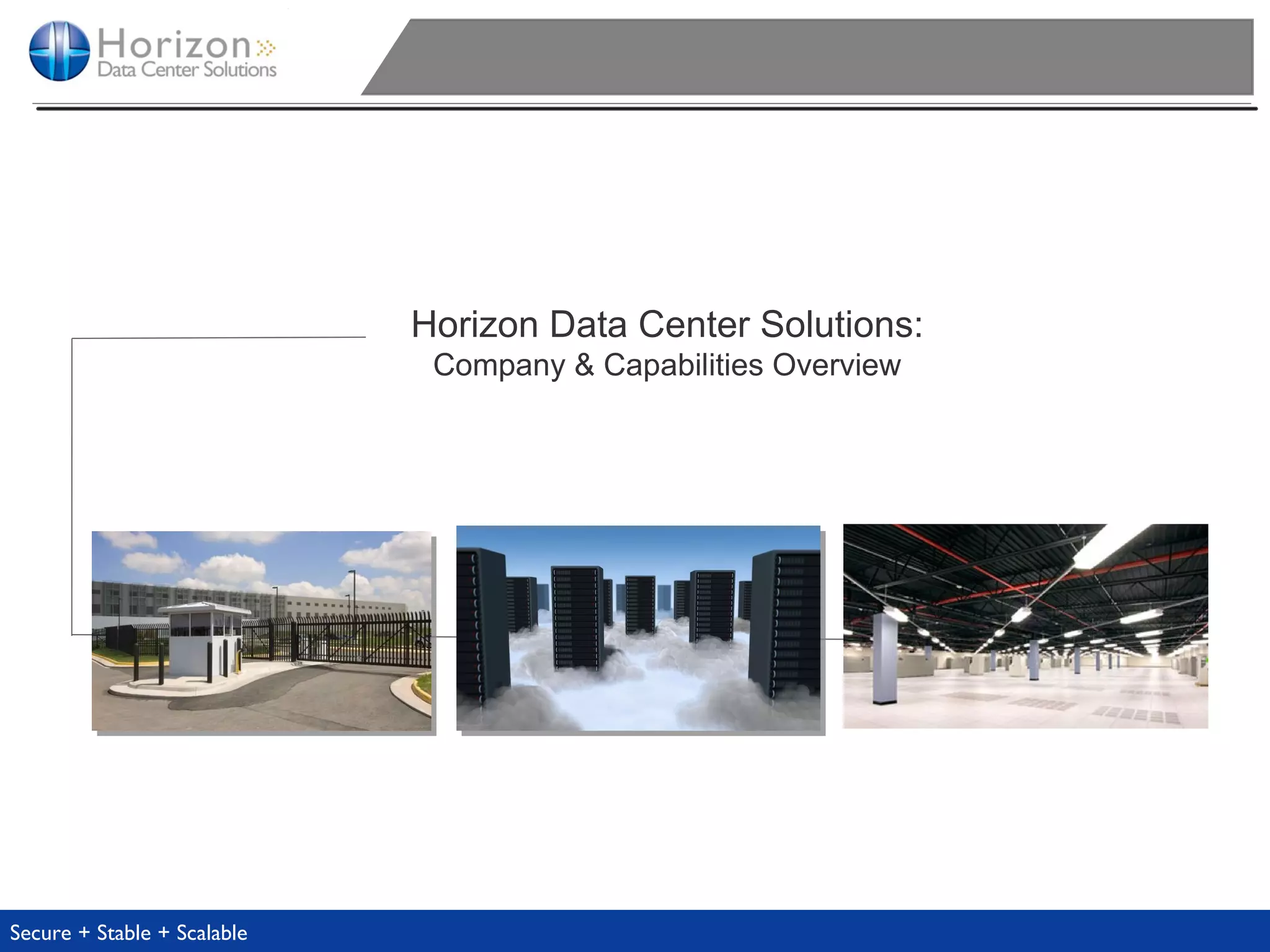 Horizon Data Center Solutions provides secure, stable and scalable IT infrastructure as a service (IaaS) provider. It operates three tier III data centers with redundant power and networking. Horizon was the first IaaS provider to receive Authority to Operate from the US government, demonstrating its data security and compliance with standards like SAS 70 and NIST 800-53. It offers infrastructure as a service, including compute, storage and networking resources that are customized and can scale easily for customer needs.