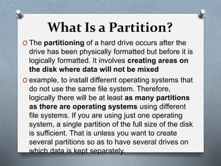 A partition divides a hard drive into logical sections for storing files and installing operating systems. There are three types of partitions: primary, extended, and logical. A primary partition can host an operating system, while an extended partition contains logical drives. The master boot record (MBR) stores information on partition locations and boots the system, but is limited to 4 primary partitions under 2.2TB each. The GUID partition table (GPT) replaces MBR and supports over 18 exabytes per partition. GPT uses a protective MBR for compatibility with older systems.