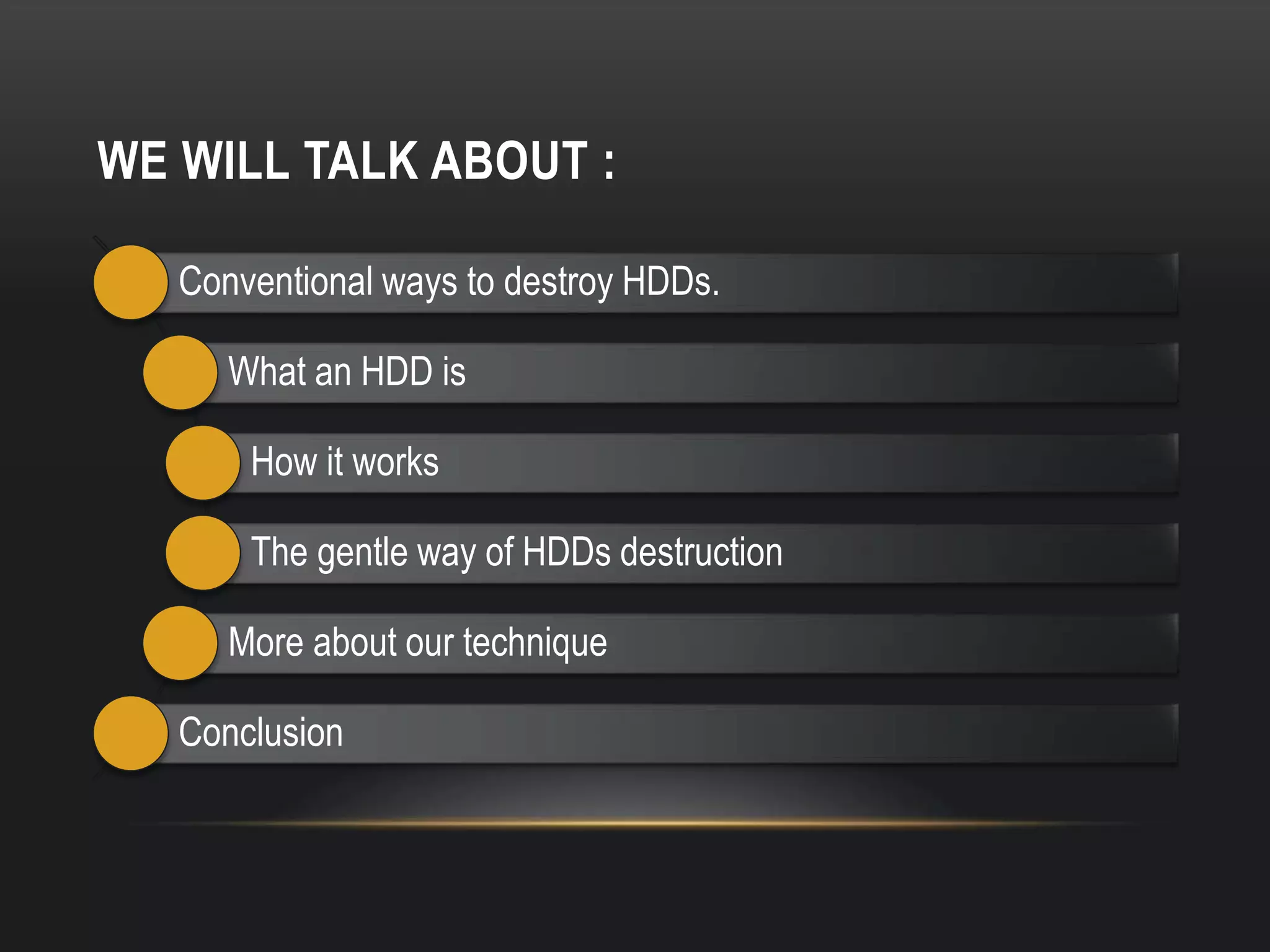 This document discusses how to destroy HDD data. It begins by explaining conventional deletion and formatting methods. It then provides more details on HDD components like how they work and what an HDD is. The document recommends degaussing as a gentle way to destroy data. Degaussing works by generating a magnetic field to erase data traces. Finally, the document concludes that degaussing is a reliable, safe, and worldwide technique for HDD data destruction.