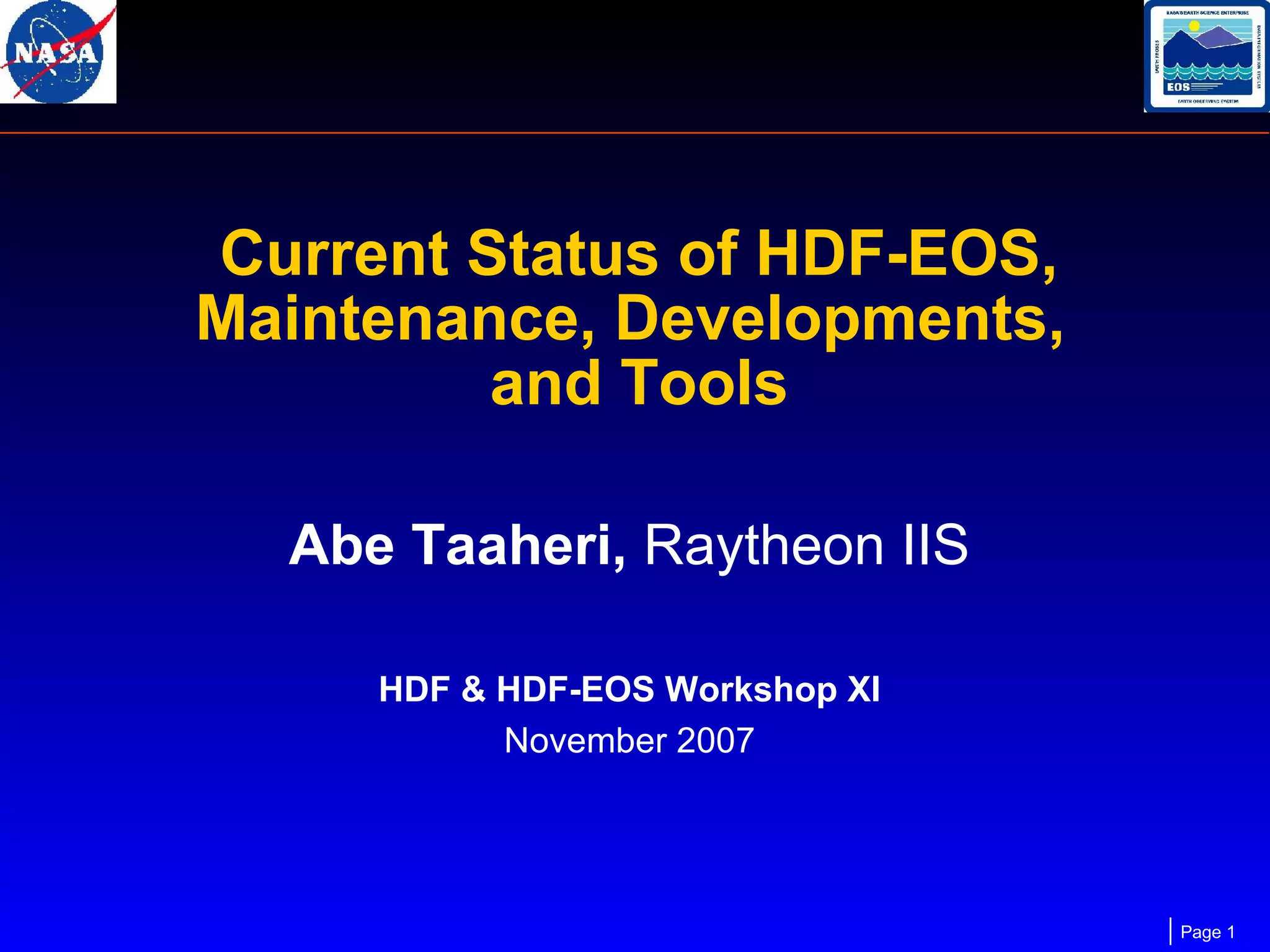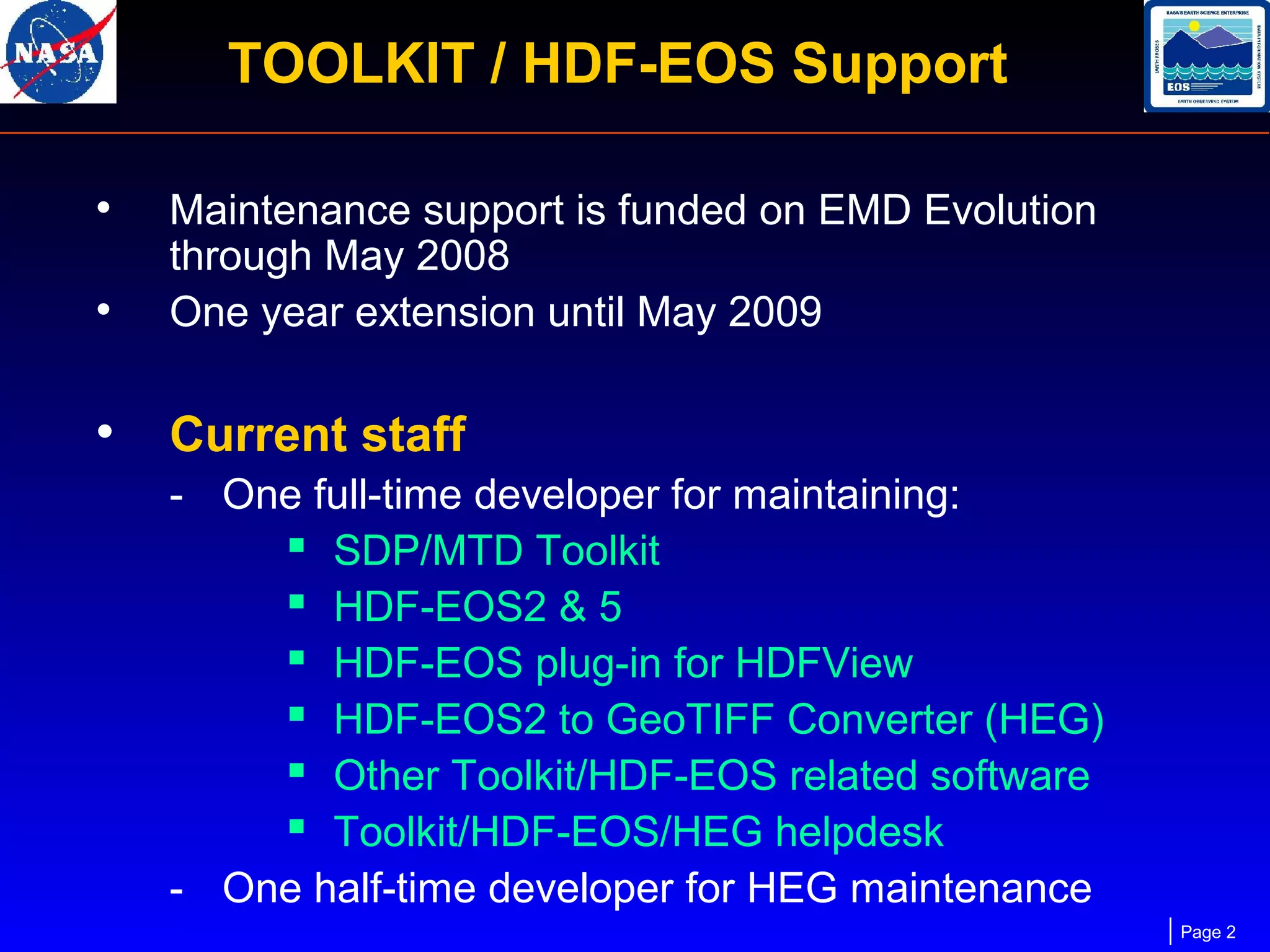 The document discusses the current status and future plans for HDF-EOS, a software toolkit for working with Earth science data files. It notes that maintenance support is funded through May 2009, with one full-time and one half-time developer. Major software components like the SDP Toolkit, HDF-EOS2, HDF-EOS5, and the HDF-EOS to GeoTIFF Converter are maintained and new releases planned. Future development focuses on auto-configuration, 64-bit support, and improved tools for viewing and converting HDF-EOS files.