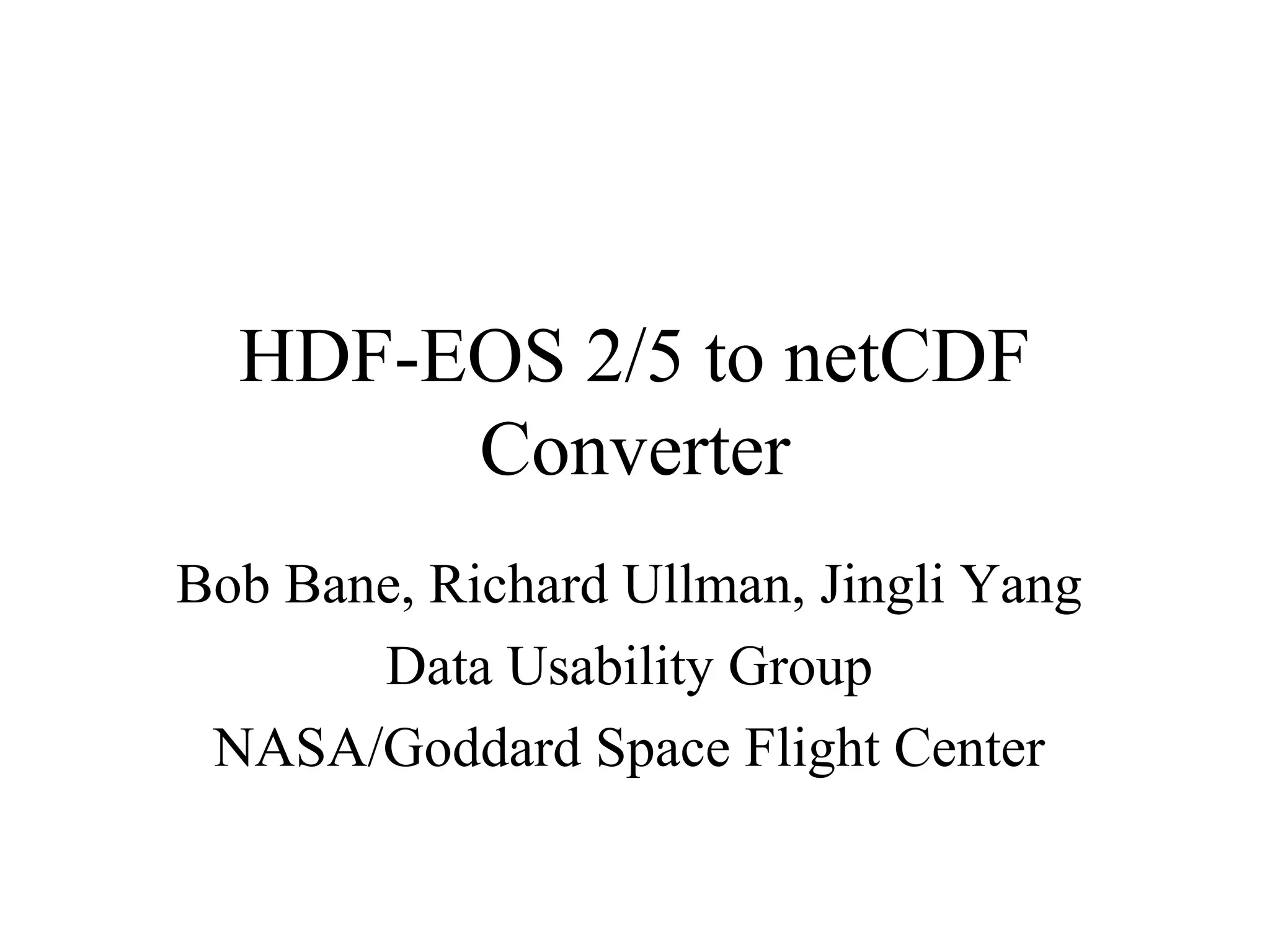 The document discusses the conversion process from HDF-EOS formats to NetCDF, highlighting the interoperability methods and conventions for data usability. It outlines the various characteristics of HDF and NetCDF, focusing on data structures, dimensions, attributes, and conversion strategies. Additionally, it details the use of specific tools and libraries designed for efficient conversion while maintaining data integrity.