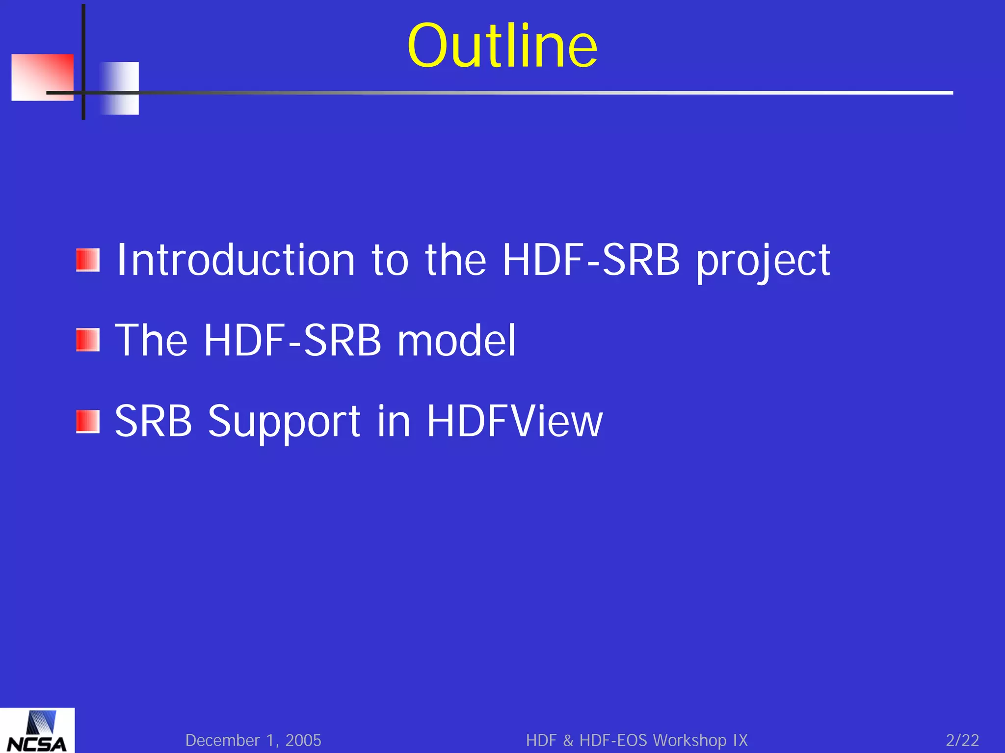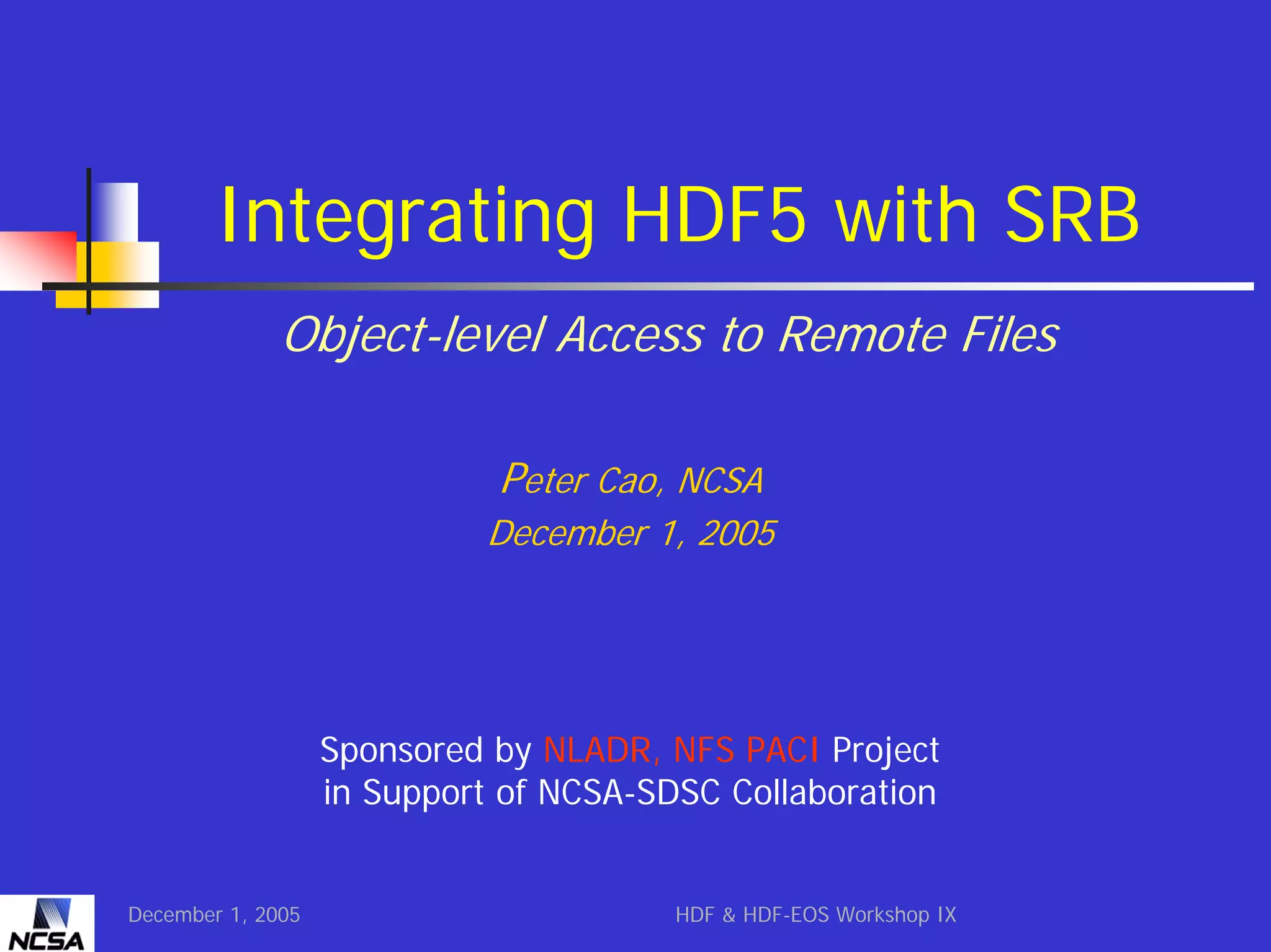 The document outlines the integration of HDF5 with the Storage Resource Broker (SRB) to facilitate object-level access to remote files. It describes the architecture and objectives of the HDF-SRB project, which aims to enhance data indexing, searching, and access control for large datasets. Future developments include adding write capabilities and improved support for complex data types and metadata indexing.