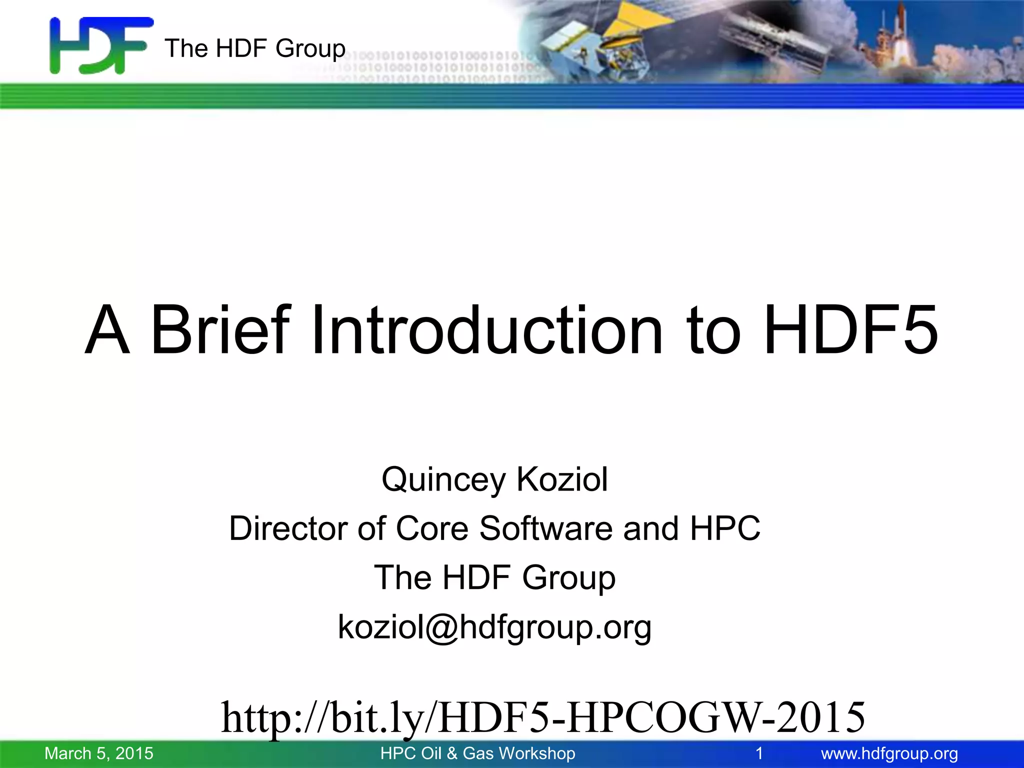 This document introduces HDF5, a hierarchical data format that is designed for high-volume and complex data management, providing tools for efficient data sharing and long-term preservation. It outlines the architecture, functionalities, and benefits of HDF5, including recent applications in the oil and gas industry and planned features for version 1.10. Additionally, it discusses support services provided by The HDF Group, showcasing its commitment to improving data handling capabilities across various platforms.