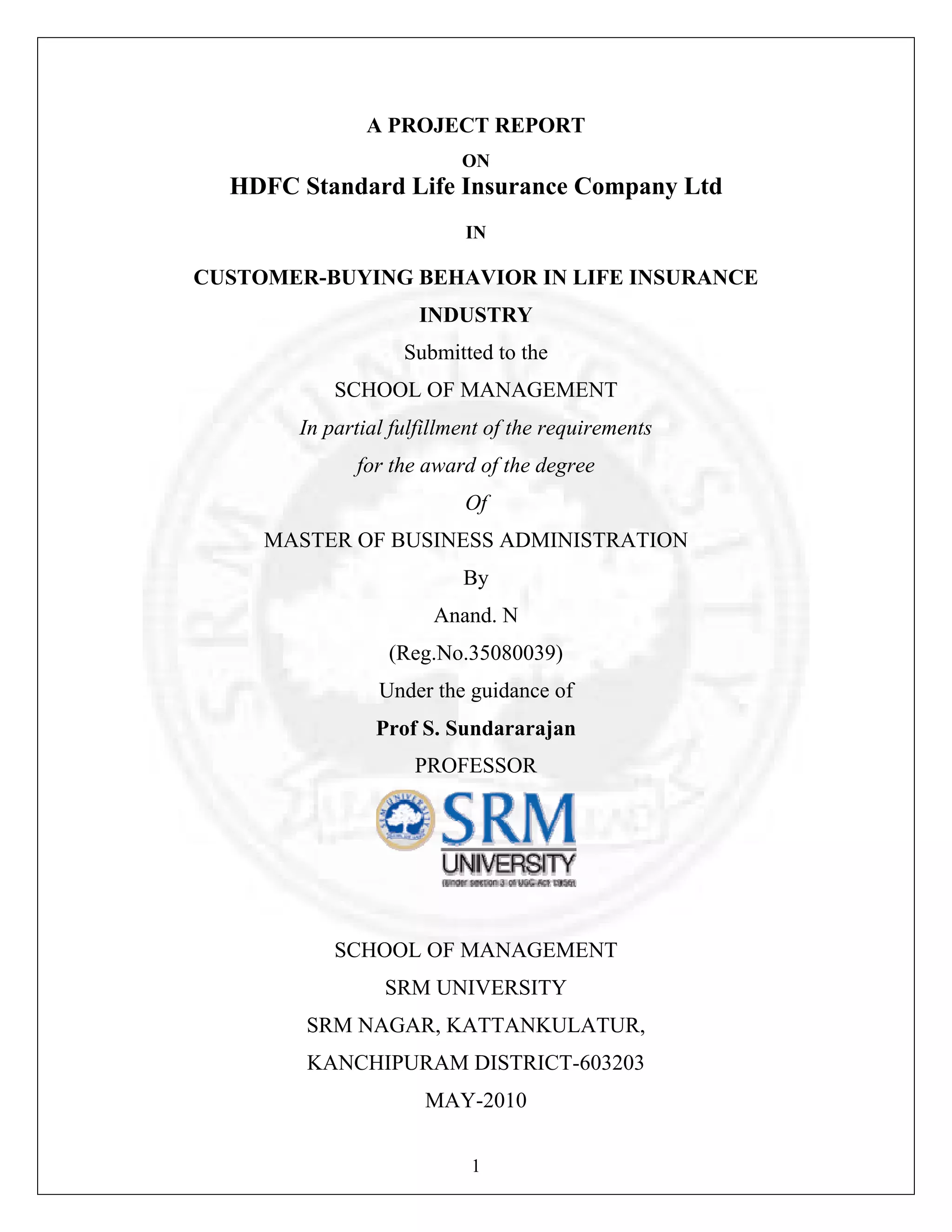 This document is a project report submitted to SRM University by Anand.N to fulfill the requirements of a Master's degree in Business Administration. The project examines customer buying behavior in the life insurance industry, with a focus on HDFC Standard Life Insurance Company Ltd. The report includes an introduction outlining the objectives and scope of the study. It also provides information on the research methodology used. Several chapters analyze and interpret data collected on customer perceptions and satisfaction with HDFC Standard Life. The report concludes with findings and suggestions.