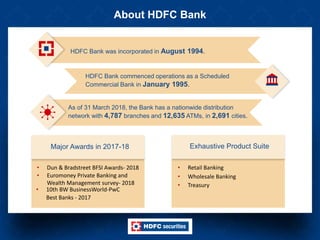 HDFC Bank provides a wide range of financial products and services including retail banking, wholesale banking, treasury services, and investment services. It has a nationwide network of over 4,787 branches and 12,635 ATMs. HDFC Securities is a subsidiary of HDFC Bank and offers investment services including equities, mutual funds, insurance, loans, and portfolio management. It provides these services through multiple platforms including a website, mobile app, branches, and a central dealing desk that can be accessed by phone. HDFC Securities has received several awards for its services and aims to provide customized investment solutions to meet customers' needs.