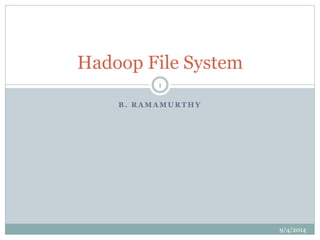 The document describes the key features and architecture of the Hadoop Distributed File System (HDFS). HDFS is designed to reliably store very large data sets across clusters of commodity hardware. It uses a master/slave architecture with a single NameNode that manages file system metadata and regulates client access. Numerous DataNodes store file system blocks and replicate data for fault tolerance. The document outlines HDFS properties like high fault tolerance, data replication, and APIs.