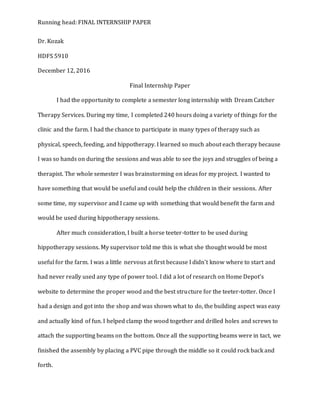 Jordan Lowery completed a 240-hour internship at Dream Catcher Therapy Services where they participated in various therapies like physical, speech, feeding, and hippotherapy. For their project, they built a horse teeter-totter to be used in hippotherapy sessions to help build core strength and balance. The internship provided valuable learning experiences about developmental milestones and treatment plans for different disabilities. Jordan was grateful for the opportunity and knowledge gained to benefit their future career.