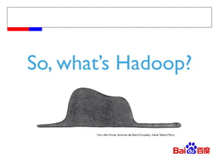 为什么选择 Hadoop ?Need to process huge datasets on large clusters of computers Very expensive to build reliability into each application. Nodes fail every day f ailure is expected, rather than exceptional. The number of nodes in a cluster is not constant. Need common infrastructure Efficient, reliable, easy to use Open Source, Apache License