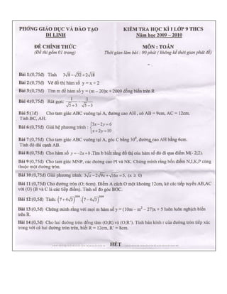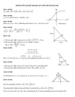 ÑEÀ THI HOÏC KYØ I LÔÙP 9 HUYEÄN DI LINH Baøi 1: (0,75ñ) y A = 3 8 − 32 + 2 18 = 6 2 − 4 2 + 6 2 = 8 2 y=x+2 2 Baøi 2: (0,75ñ) y = x + 2 ÑCTT A(0; 2) ÑCTH( –2; 0) –2 x 0 Baøi 3: (0,75ñ) Haøm soá y = (m – 20)x + 2009 ñoàng bieán treân R ⇔ m – 20 > 0 ⇔ m > 20. Ñoà thò baøi 2 Baøi 4: (0,75ñ) C 1 1 5 − 3 − ( 5 + 3) −6 3 − = = = 5 +3 5 −3 ( 5) 2 − 32 −4 2 12 cm Baøi 5: (1ñ) H +/ Xeùt tam giaùc ABC vuoâng taïi A ta coù: BC = 122 + 92 = 15cm. A B +/ Xeùt tam giaùc ABC vuoâng taïi A ta coù: AH.BC = AB.AC 9 cm AB.AC Suy ra: AH = = 7, 2(cm) BC Baøi 6: (0,75ñ) 3x − 2 y = 6 (1) x + 2 y = 10 (2) C CVTV: 4x = 16 ⇔ x = 4 theá x = 4 vaøo (2) ta coù y = 3. Vaäy heä coù moät nghieäm duy nhaát (x; y) = (4; 3) 300 H Baøi 7: (0,75ñ) 6cm A B +/ Xeùt tam giaùc ABC vuoâng taïi A coù goùc C baèng 300 => goùc B baèng 600. +/ Xeùt tam giaùc AHB vuoâng taïi H ta coù AB = AH : sin600 = 4 3 cm Baøi 8: (0,75ñ) M K I Vì ñoà thò haøm soá y = –2x + b ñi qua A(–2; 2) ta coù 4 + b = 2 vaäy b = –2. Baøi 9: (0,75ñ) P N J 1 Goïi J laø trung ñieåm cuûa PN. => JP = JN = PN (1) 2 1 ÖÙng duïng ñònh lyù ñöôøng trung tuyeán baèng ½ caïnh huyeàn ta coù JK = JI = PN (2) 2 Töø (1) vaø (2) ta coù JP = JI = JK = JN => boán ñieåm K, P, N, I naèm treân ñöôøng troøn taâm J baùn kính ½ PN.