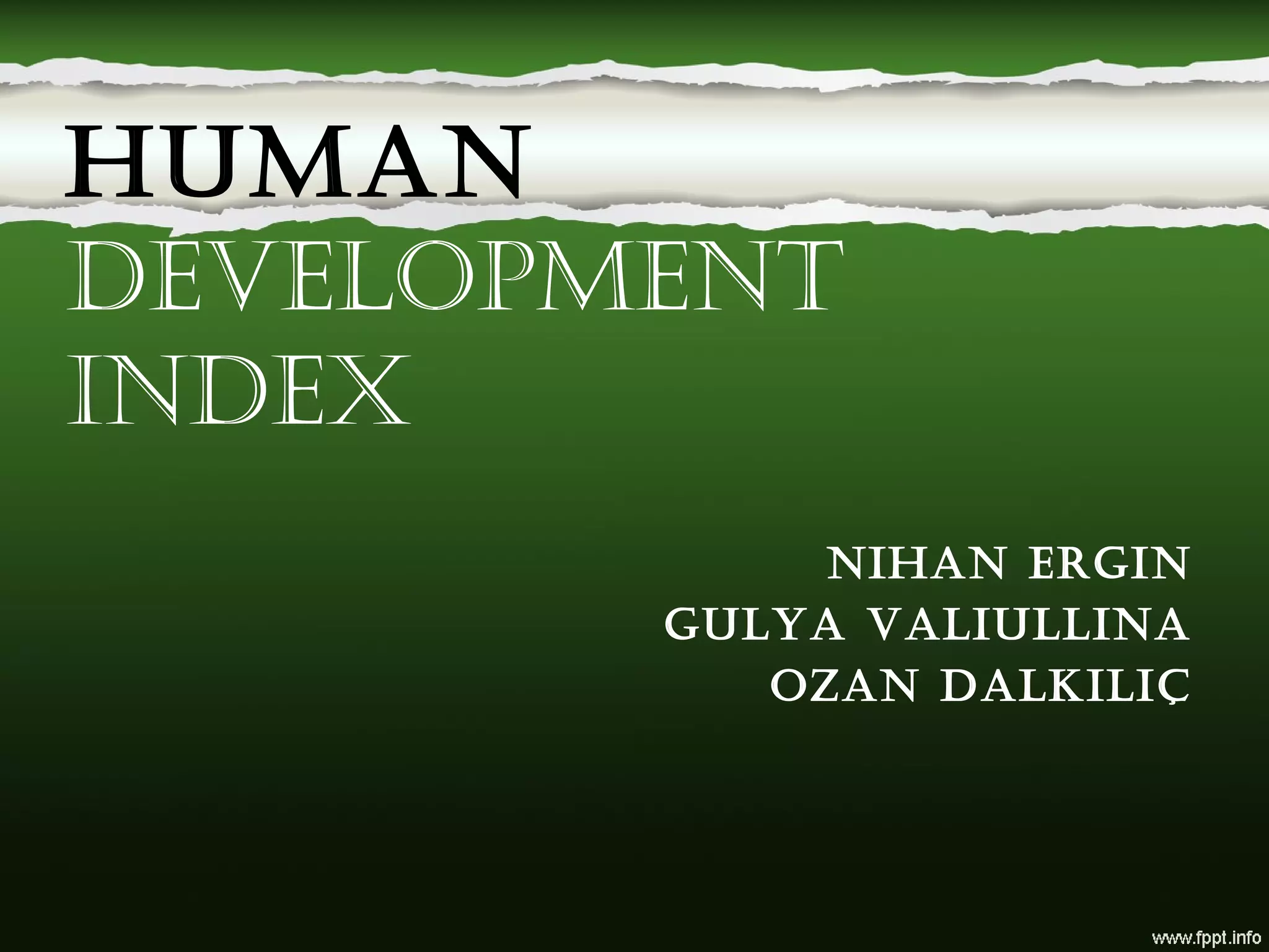 This document provides information about the Human Development Index (HDI), including its basic dimensions of health, education, and income. It then presents statistics about Turkey's HDI values in these dimensions, as well as HDI trend data for Turkey and several other countries from 2000 to 2010. The document aims to explain what the HDI is and provide real-world examples of HDI statistics.