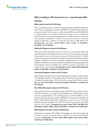 HDIL is initiating coverage with a buy recommendation and target price of Rs356 per share. HDIL's Mumbai International Airport redevelopment project is on track to generate significant revenue. The company is also set to benefit from strong land development rights (TDR) prices in Mumbai, which have recovered in recent years. At the current price of Rs284 per share, HDIL is trading at a 28% discount to the analyst's 1-year forward estimate of net asset value (NAV) of Rs395 per share. The target price of Rs356 represents a 10% discount to the estimated 1-year forward NAV.