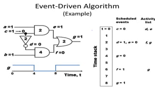 This document discusses HDL-based simulators. It defines simulation as modeling a design's function and performance. There are two main types of simulators: HDL-based and schematic-based. HDL-based simulators use an HDL language like VHDL to describe the design and testbench. These can be either event-driven or cycle-based. Event-driven simulators efficiently model all nodes and detect glitches. Cycle-based simulators compute the steady-state response at each clock cycle without detailed timing.