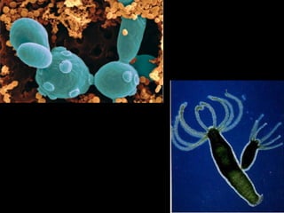 Asexual reproduction in amoeba occurs through binary fission. The amoeba cell divides through mitosis to form two identical daughter cells. Each daughter cell is an exact clone of the parent cell. Binary fission allows for rapid multiplication of amoeba in favorable environmental conditions. The contractile vacuole acts to regulate the amoeba's water content through osmosis, as the cell takes in more water than its surroundings. It repeatedly swells and bursts to expel excess water from the cell.