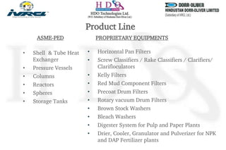 HDO Technologies Limited manufactures various equipment including filters, classifiers, heat exchangers, pressure vessels, and tanks primarily for industries such as petrochemicals, power plants, and nuclear applications. The company has achieved several certifications, including ISO 9001:2008 and OHSAS 18001:2007, and is an approved vendor for multiple prominent public sector units and engineering companies. Their capabilities encompass extensive machining, welding, and testing facilities, with a documented history of design calculations and equipment specifications dating back to 2008.