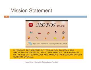 This document describes the features and benefits of HDPOS SMART software for garment stores. It discusses how the software can help automate key business functions like inventory management, customer management, billing and accounting. It also outlines challenges of adopting technology and how HDPOS SMART addresses issues like support, data security and flexibility. The software allows easy management of sales, customers and inventory through features like barcode scanning, discounts, reports and remote access.
