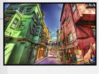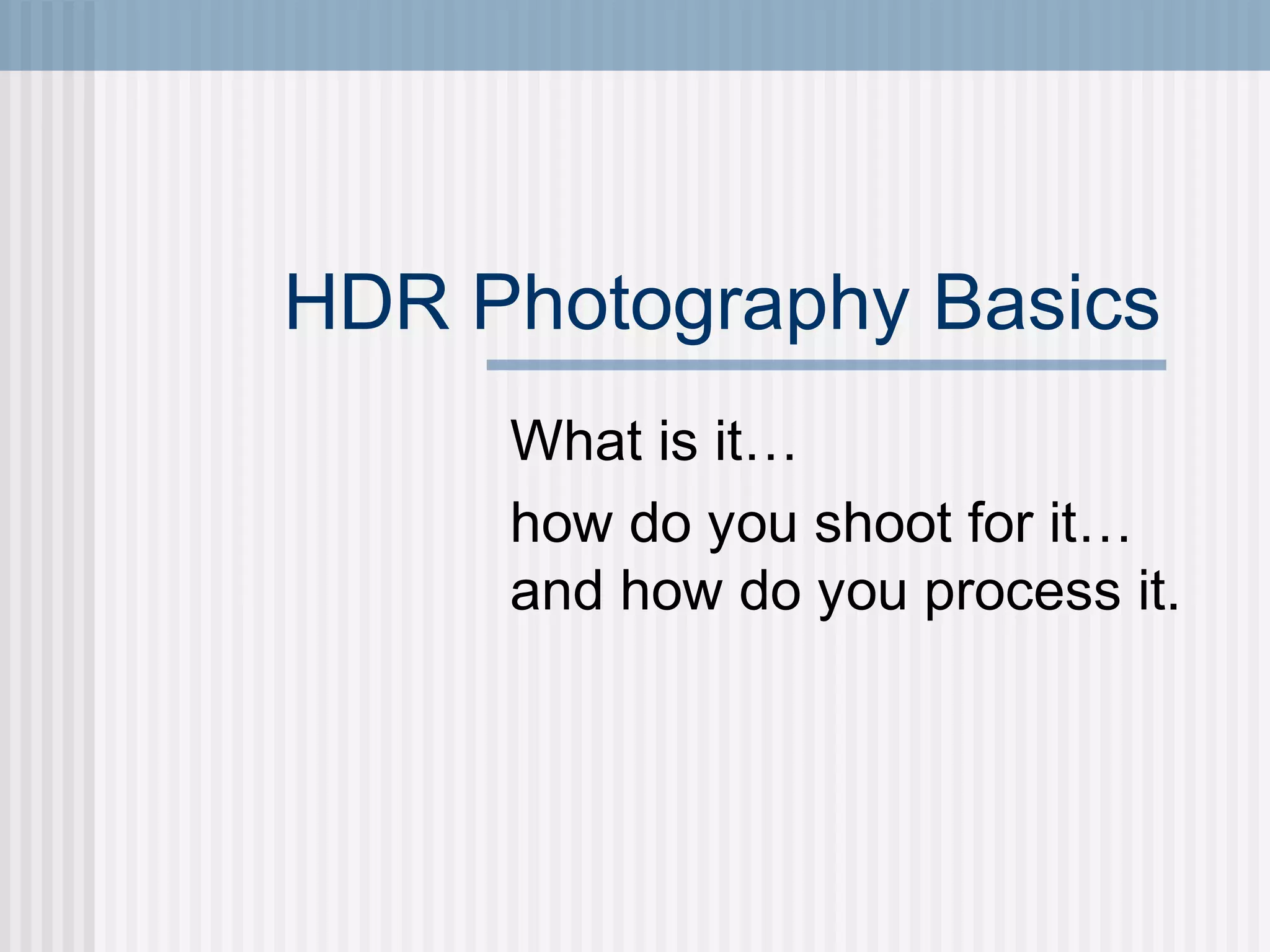 This document provides an overview of HDR photography, including what it is, how to shoot photos for it, and how to process HDR images. HDR photography involves taking multiple exposures of the same scene at different brightness levels and combining them to produce an image with a wider dynamic range than a single photo. To shoot HDR photos, a photographer mounts their camera on a tripod and takes at least three exposures of the scene - one correctly exposed, one underexposed, and one overexposed. They then use HDR processing software to merge the exposures into a single image that better represents the full brightness range.