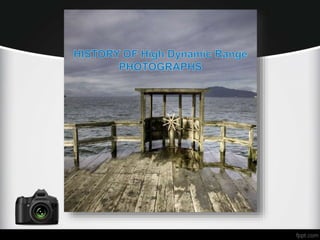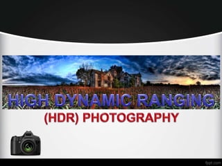 HDR photography captures multiple photographs at different exposure levels and combines them to produce an image with a wider dynamic range than standard cameras. It compensates for the loss of detail in bright and dark areas of an image taken with a limited exposure. There are two main types of HDR images: computer renderings and those resulting from merging multiple low-dynamic range photographs. The general workflow involves capturing bracketed or multi-exposure images, processing them in HDR software to combine into a high dynamic range image, and final processing in photo editing software.