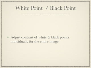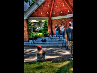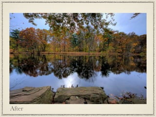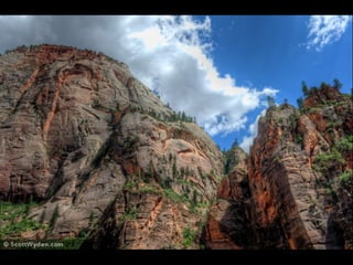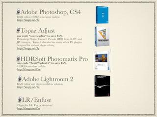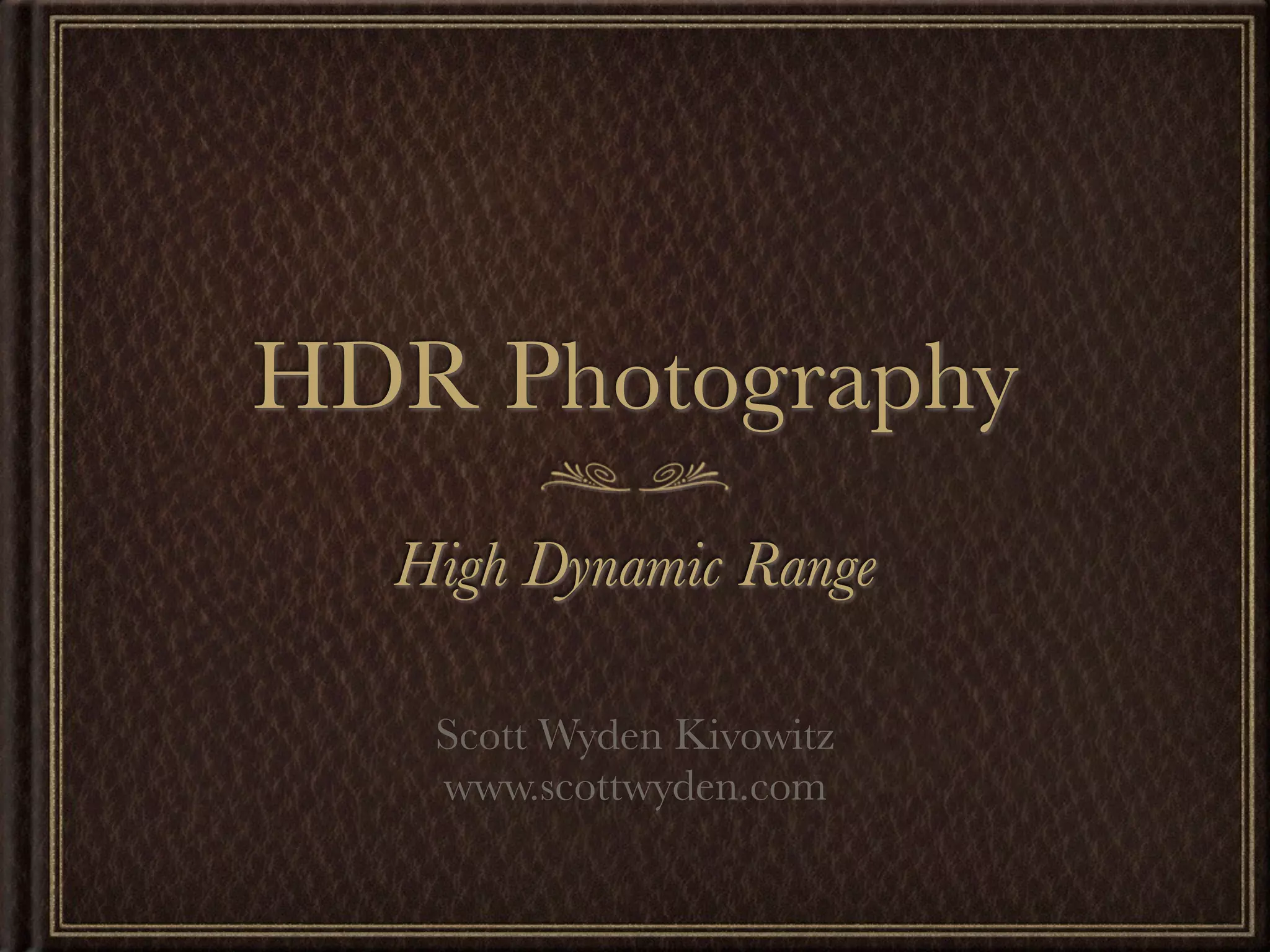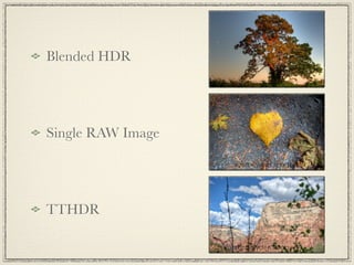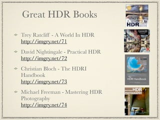 This document discusses high dynamic range (HDR) photography. It begins by defining HDR imaging and explaining that it allows for a greater dynamic range of brightness levels than standard photography. It then provides examples of 9 shot HDR photos and discusses the benefits of HDR, including boosting creativity and allowing shooting in various lighting conditions. It explains the basic process of taking HDR photos using bracketed exposures and merging them. It also discusses different HDR styles, needed equipment, and tips for shooting and processing HDR photos. It provides resources for learning more about HDR photography.
