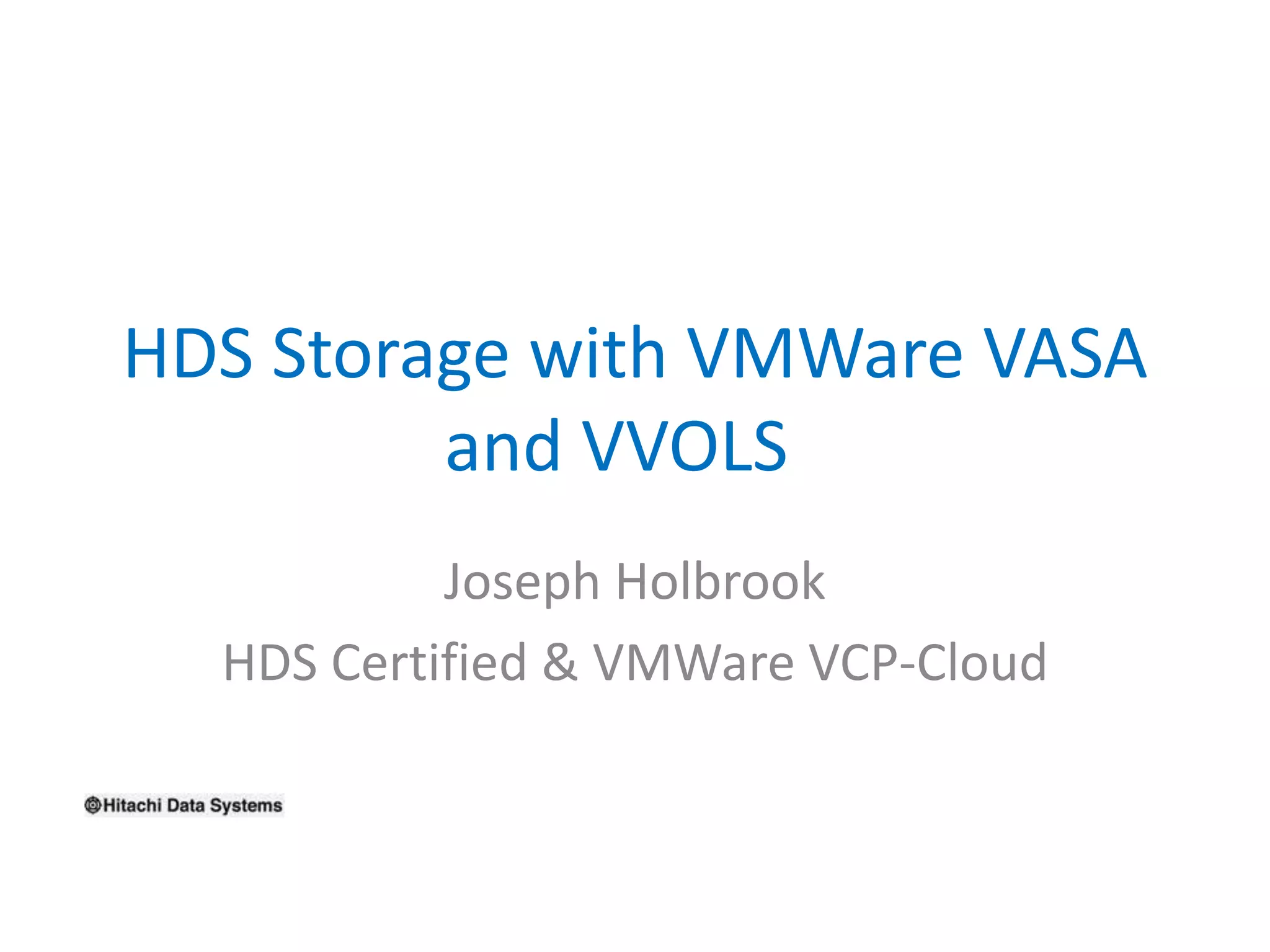 The document discusses the capabilities and benefits of integrating Hitachi Data Systems (HDS) storage with VMware's vSphere API for Storage Awareness (VASA) and Virtual Volumes (VVols). It highlights how VASA enhances storage management by allowing VMware vCenter to monitor and report on storage resources, while VVols introduce a more efficient VM-level storage management framework. The document also outlines VMware storage best practices and the significant advantages of using HDS storage within VMware environments, including improved performance and capacity efficiency.