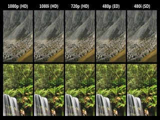 The document discusses the history and development of high-definition television (HDTV) from the 1930s to present day. It covers early HD systems with 240 lines of resolution in the 1930s-1950s, the global development of HD standards in the 1950s-1970s including systems in Germany and the Soviet Union, and Japan's development of the first consumer HD system in 1969. It then discusses the introduction and adoption of HDTV in the United States from the 1980s-1990s and the establishment of the Grand Alliance standard in 1994. Finally, it lists the many HDTV broadcast and cable channels available today globally.