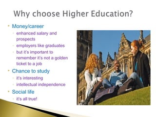 The document is a presentation given to parents about higher education options after completing A-Levels. It discusses various university choices including campus, civic, large and small universities. It covers the UCAS application process and important deadlines. Statistics on acceptance rates and popular degree subjects are provided. Financial options like loans and scholarships are explained. University open days are recommended to help with research and decisions.