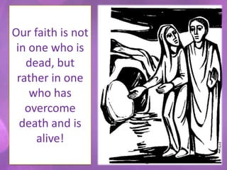 This reflection discusses Easter and the resurrection of Christ from a Christian perspective. It explores how Christ has overcome death and is alive, calling believers to have faith in Him and to open their hearts to see Him. It encourages readers to follow Christ's example and give witness to Him in the world.