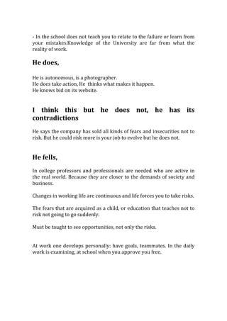 The document discusses the disconnect between education and real-world work. It notes that universities focus on teaching theories and helping students pass exams, rather than preparing them for careers or teaching practical skills. A man shares his experience graduating with an economics degree but learning most of what he needed for his photography job on the job. He believes schools should involve professionals and teach students to take risks, learn from failures, and see opportunities rather than just risks. The discussion advocates for reforming education to better align with the demands of the workplace and give students more practical experience.