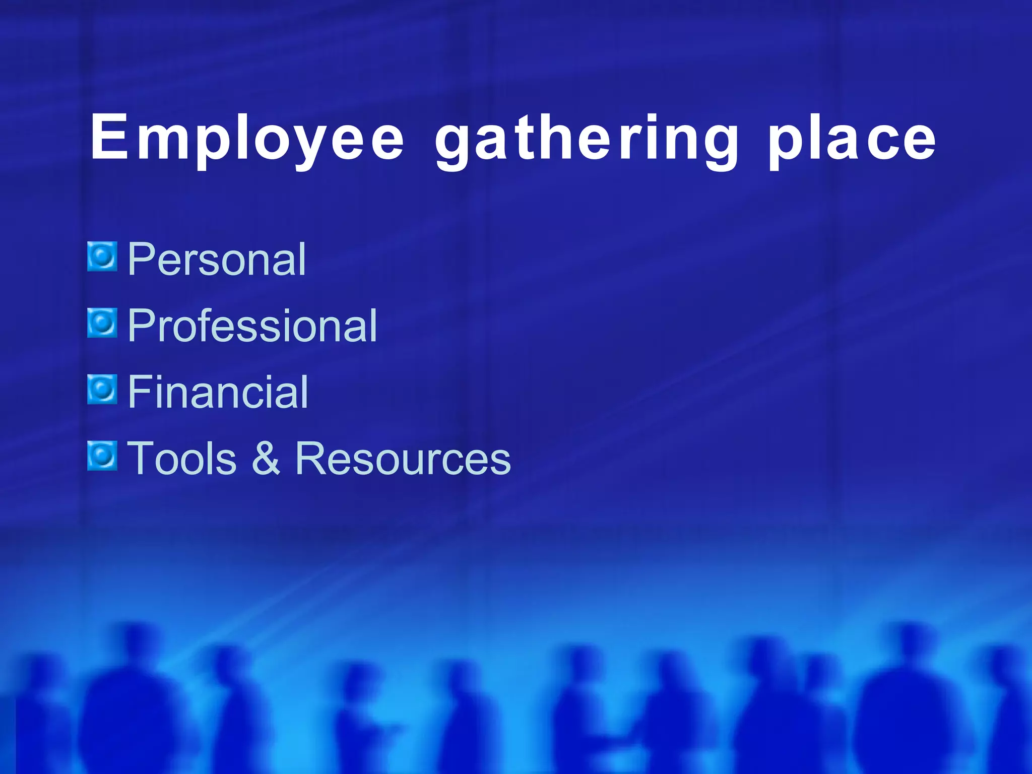 This document outlines resources available to employees in three categories: personal, professional, and financial. Under personal, employees can access benefits enrollment, insurance options, time off policies, and wellness programs. Professional resources include computer training, workplace values, safety commitments, and service awards. Finally, financial tools contain education assistance, discounts, retirement planning, tax help, and savings resources.