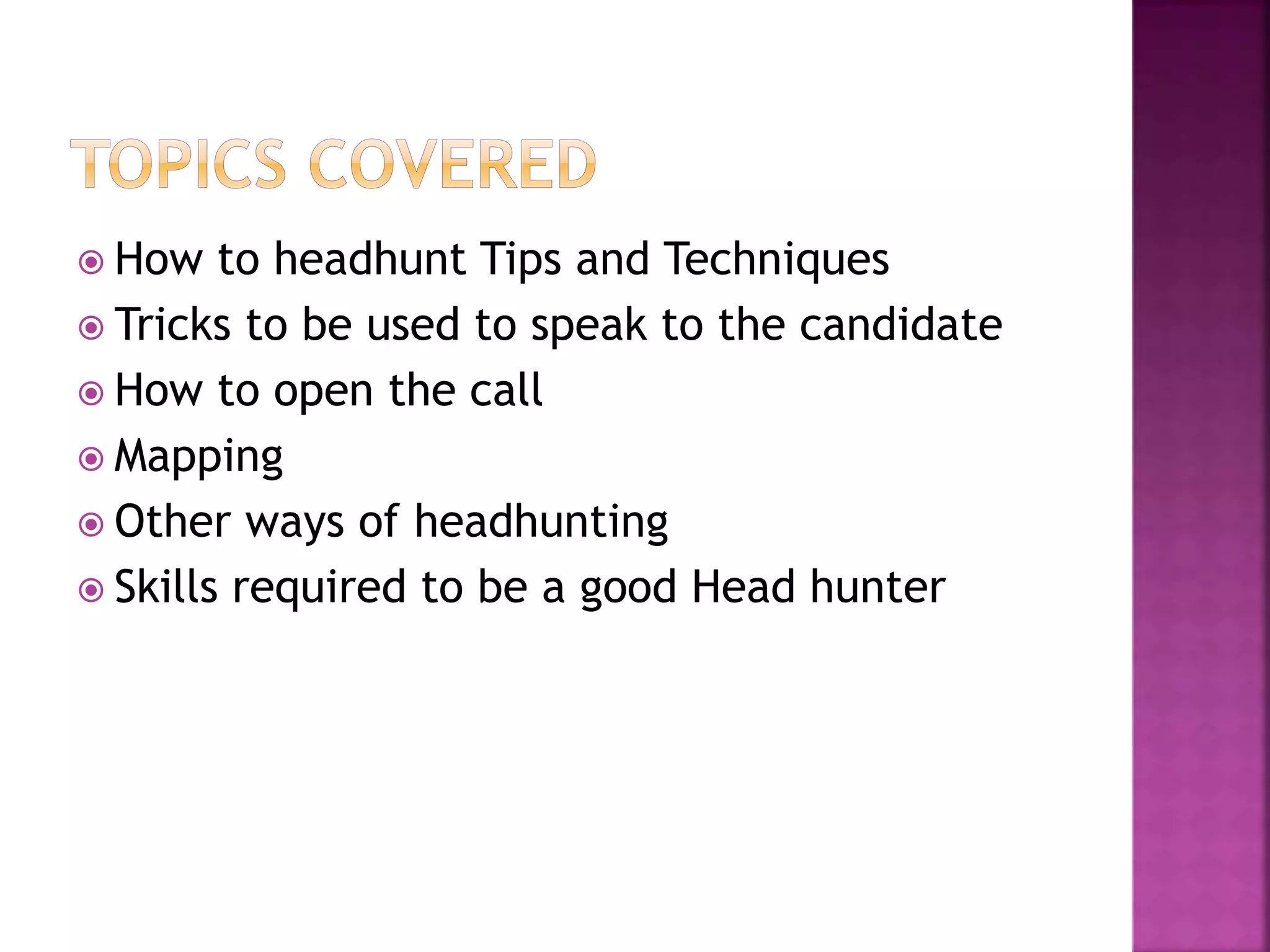 This document provides tips and techniques for headhunting, including how to open calls with candidates, conduct mapping of target companies, develop scripts, and use tricks to get past receptionists. It also discusses doing research on job requirements, clients' businesses, organizations, and employees. Skills like confidence, communication, networking, internet searching, knowledge, perseverance, and integrity are important for headhunters.